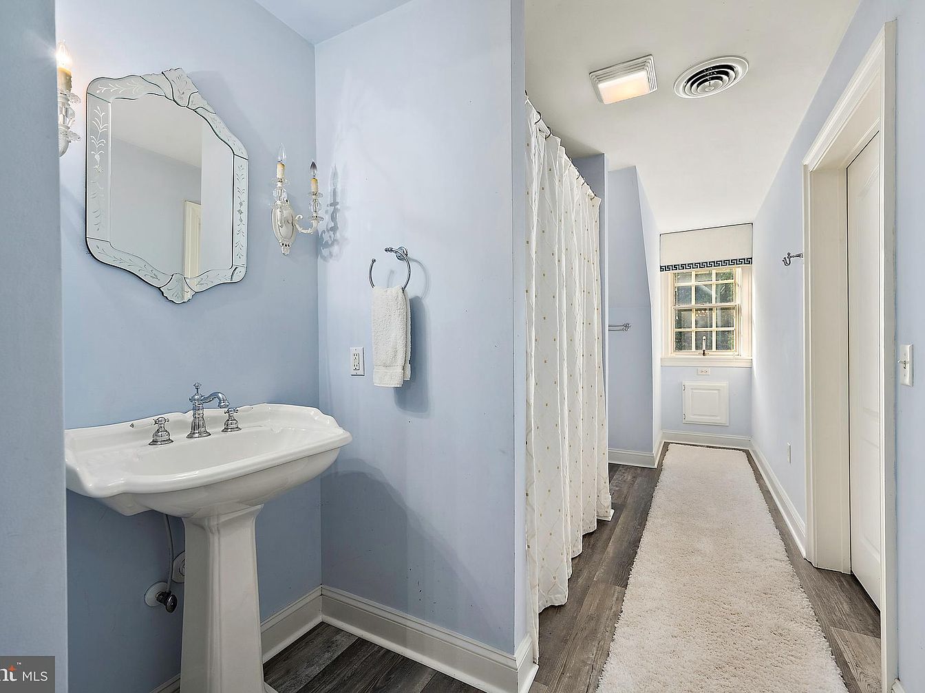 A quaint bathroom space featuring soft blue walls that create a tranquil atmosphere. A vintage-style porcelain sink with elegant chrome fixtures stands prominently. Above it, a decorative mirror with ornate detailing reflects light, enhancing the room’s brightness. Adjacent to the sink, a towel ring holds a fluffy white towel. A shower area is enclosed by a simple fabric curtain, offering privacy. Natural light streams through a window adorned with subtle trim, providing a view of the outdoors. The floor features rustic wood planks, complemented by a plush, white runner that adds warmth and comfort to the space.