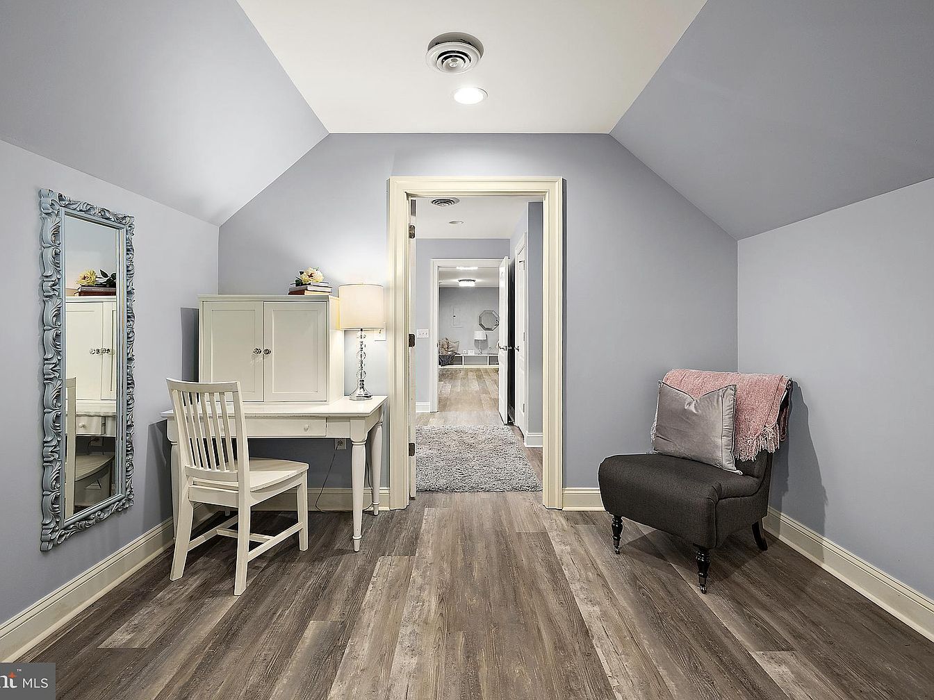 This charming hallway nook features soft gray walls that create a soothing atmosphere. The elegant white chair and matching desk invite productivity, complemented by a stylish cabinet providing discreet storage. A large, ornate mirror enhances the sense of space while adding a touch of sophistication. Light wood flooring adds warmth, contrasting beautifully with the subtle color palette. A small lamp illuminates the desk, casting a gentle glow across the area. A plush dark upholstered chair with a cozy pink throw suggests comfort, making this space perfect for relaxation or quiet reflection. The sloped ceiling adds architectural interest.
