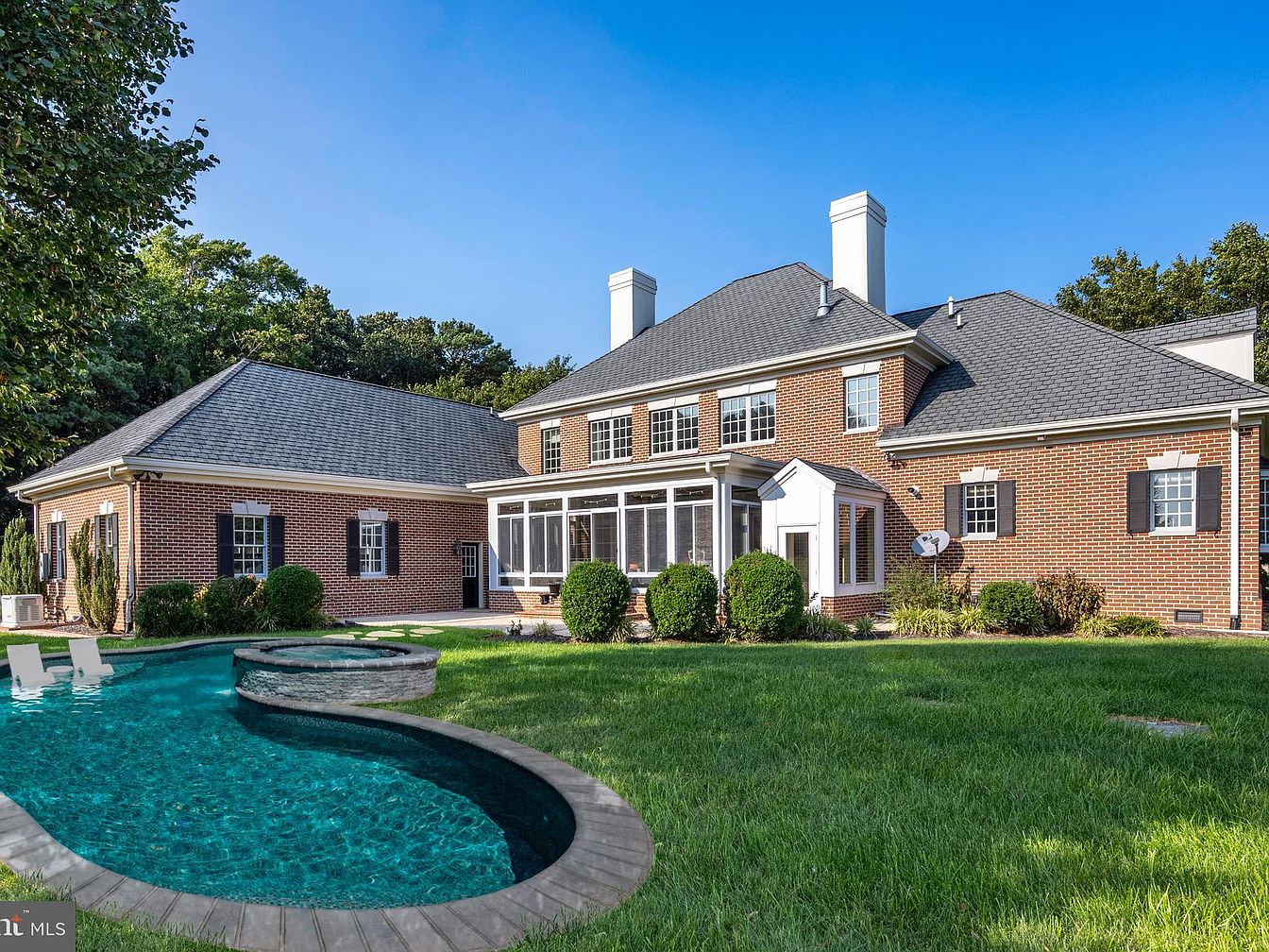 The image features a spacious backyard of a historic American home, showcasing a beautifully shaped swimming pool that spirals gracefully into a hot tub. The pool’s clear blue water contrasts with the neatly manicured green lawn, where shrubs and small hedges add a touch of nature. A screened-in porch is visible, framed with white trim, offering a cozy retreat. The house exterior displays a classic red brick façade, accented by black shutters on the windows. The multi-pitched gray roof adds character and enhances the classic architectural style of this inviting outdoor space.