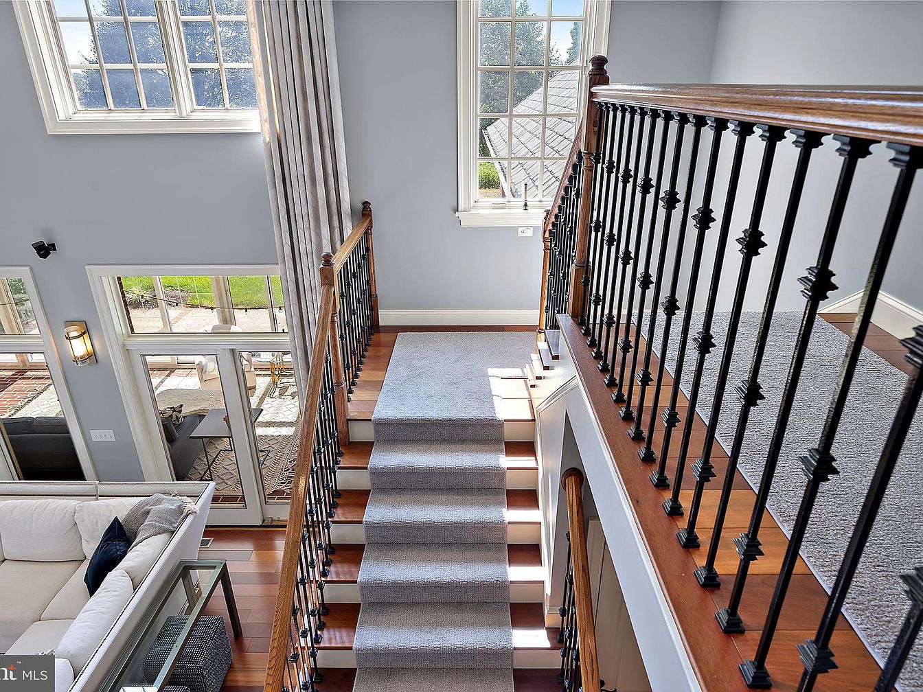 The space features a beautifully designed staircase leading up to a landing area. Soft gray carpeting covers the stairs, complemented by rich wooden railings that display elegant iron balusters, adding a touch of sophistication. Light streams in through large, multi-pane windows, casting patterns on the wall and illuminating the soft gray tones of the space. Adjacent to the stairs, a substantial white sofa adorned with navy and gray cushions can be seen, creating a cozy atmosphere. A minimalist glass table rests on polished hardwood floors, enhancing the contemporary yet timeless aesthetic of this landing.