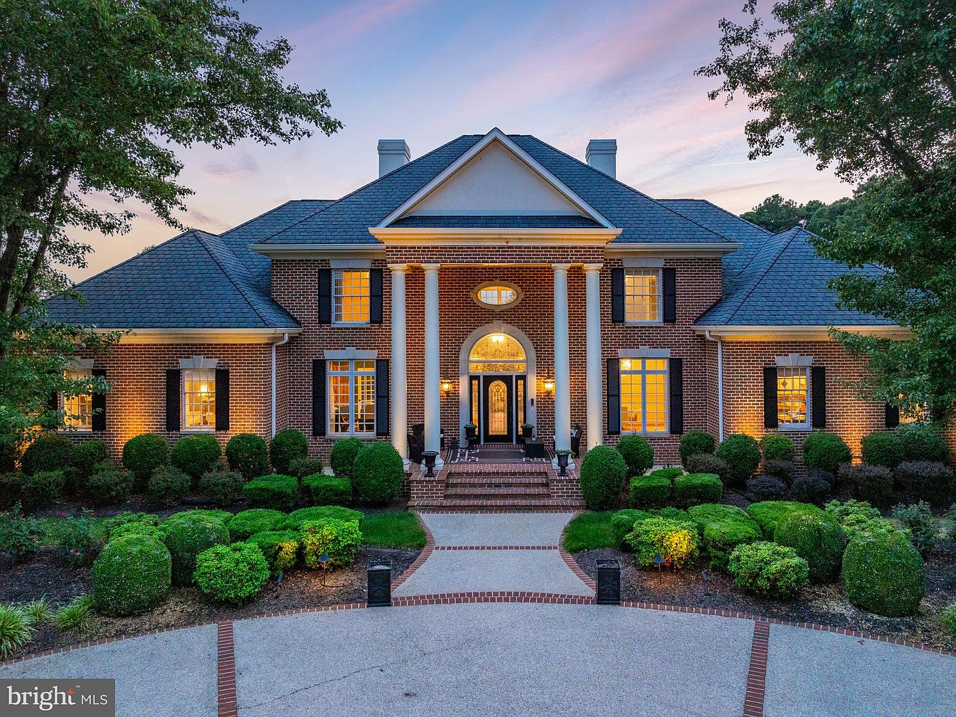 The front entrance features a grand façade with classic brickwork and elegant white columns framing the doorway. The symmetrical layout is enhanced by large windows with black shutters, allowing natural light to flood the interior. Lush, manicured hedges and rounded topiary plants flank the entrance, providing a structured yet welcoming feel. The paved pathway leads to the double doors, which are illuminated warmly, creating an inviting ambiance. The roof’s pitch, coupled with gabled dormers, adds to the traditional architectural style. Overall, the entrance combines sophistication with a touch of southern charm, set against a serene green backdrop.