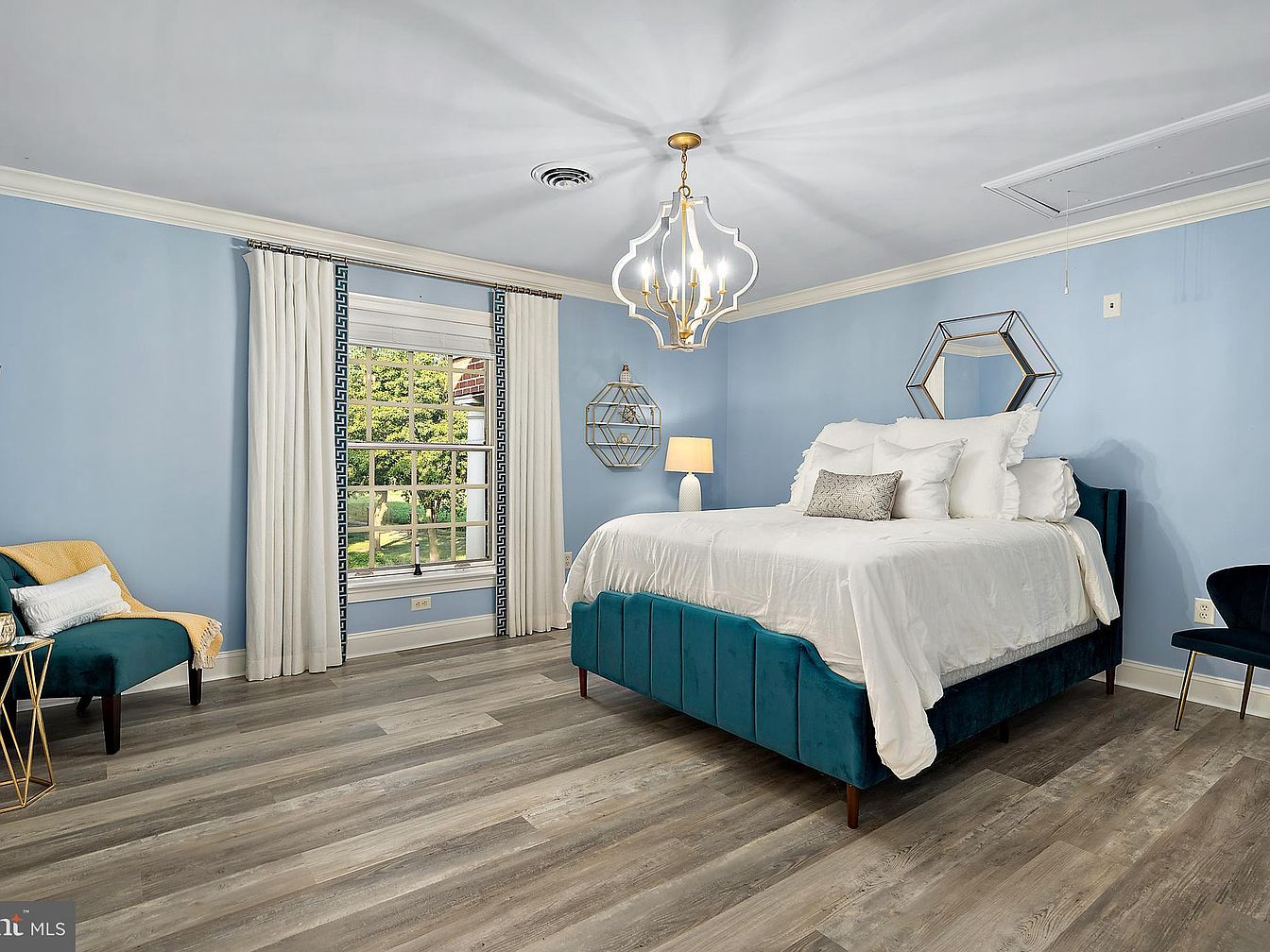 This bedroom features a serene blue color palette, creating a calming atmosphere. The bed, upholstered in deep teal, boasts a luxurious texture with plush white bedding that enhances the space’s elegance. Large, stylish window treatments frame a generous window, inviting natural light. Beside the bed, a minimalist lamp provides warm illumination. Unique geometric mirrors on the wall add a contemporary touch, reflecting light and creating depth. A cozy accent chair in bright yellow and teal adds a playful contrast to the flooring, which is a sleek, gray wood-like finish, complementing the overall modern yet inviting aesthetic.