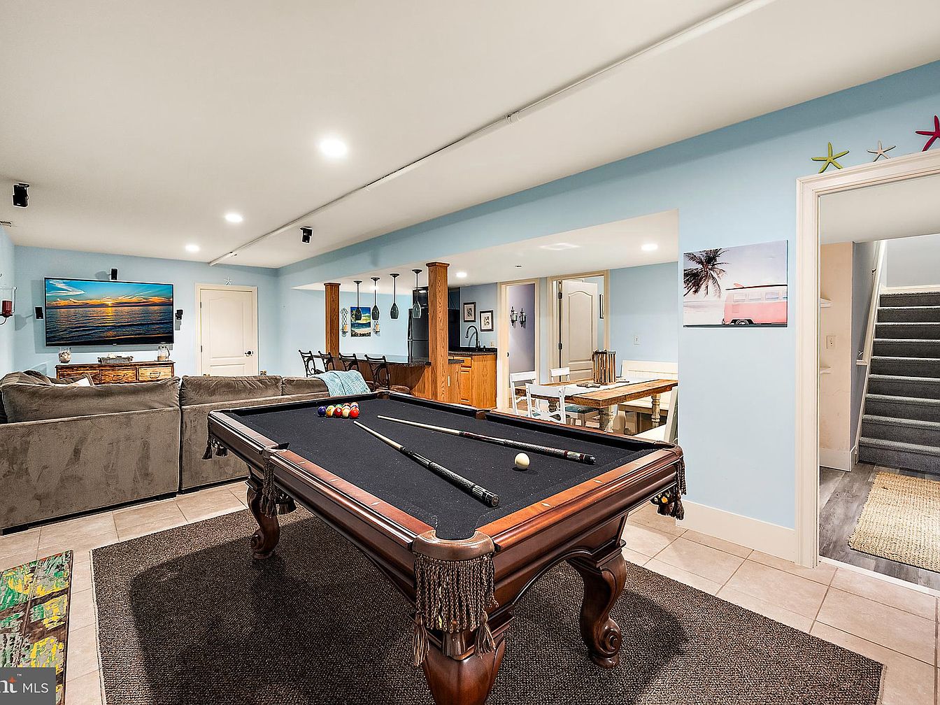 This space showcases a cozy recreation room with a spacious layout. A rich brown velvet sectional couch provides ample seating, while a billiard table takes center stage, featuring an elegant wooden frame. The soothing blue walls enhance the relaxed atmosphere, complemented by a soft beige floor. A large flat-screen TV mounted on the wall allows for entertainment, surrounded by coastal-themed artwork. A wooden bar area with high-backed chairs suggests social gatherings, while a dining table in the background offers additional seating. The warm textiles and decorative elements create an inviting environment perfect for relaxation and leisure.