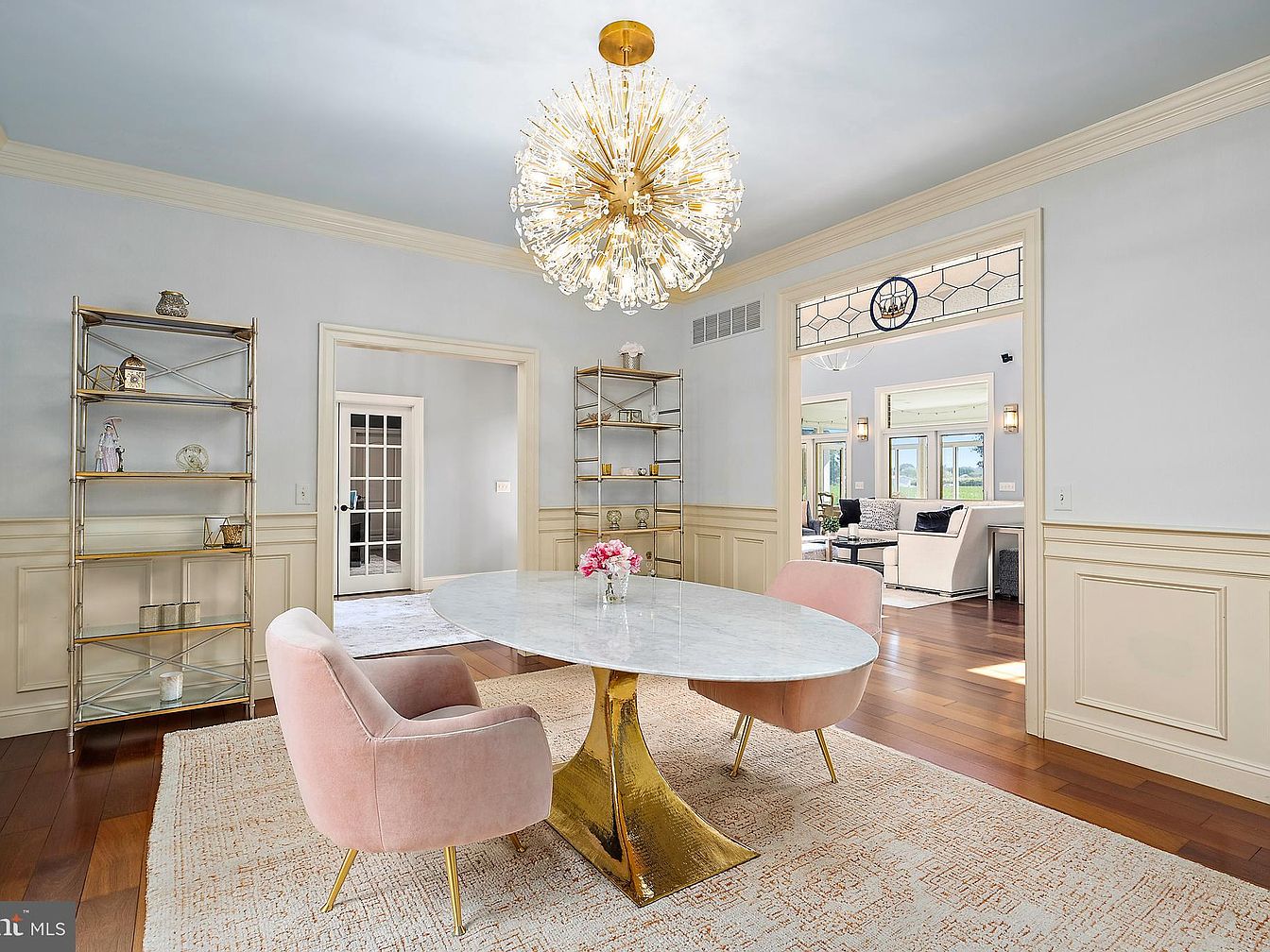 The dining area features an elegant round table with a white marble top and a striking gold base, accompanied by two plush pink chairs. The room’s light blue walls are complemented by sophisticated wainscoting, enhancing the airy feel. A stunning, modern chandelier with a starburst design illuminates the space, drawing attention to the stylish decor. Open shelving units with a sleek metallic finish are situated against the wall, showcasing decorative items. Light hardwood flooring adds warmth, while an area rug with a subtle pattern grounds the room, creating a harmonious blend of classic and contemporary aesthetics.