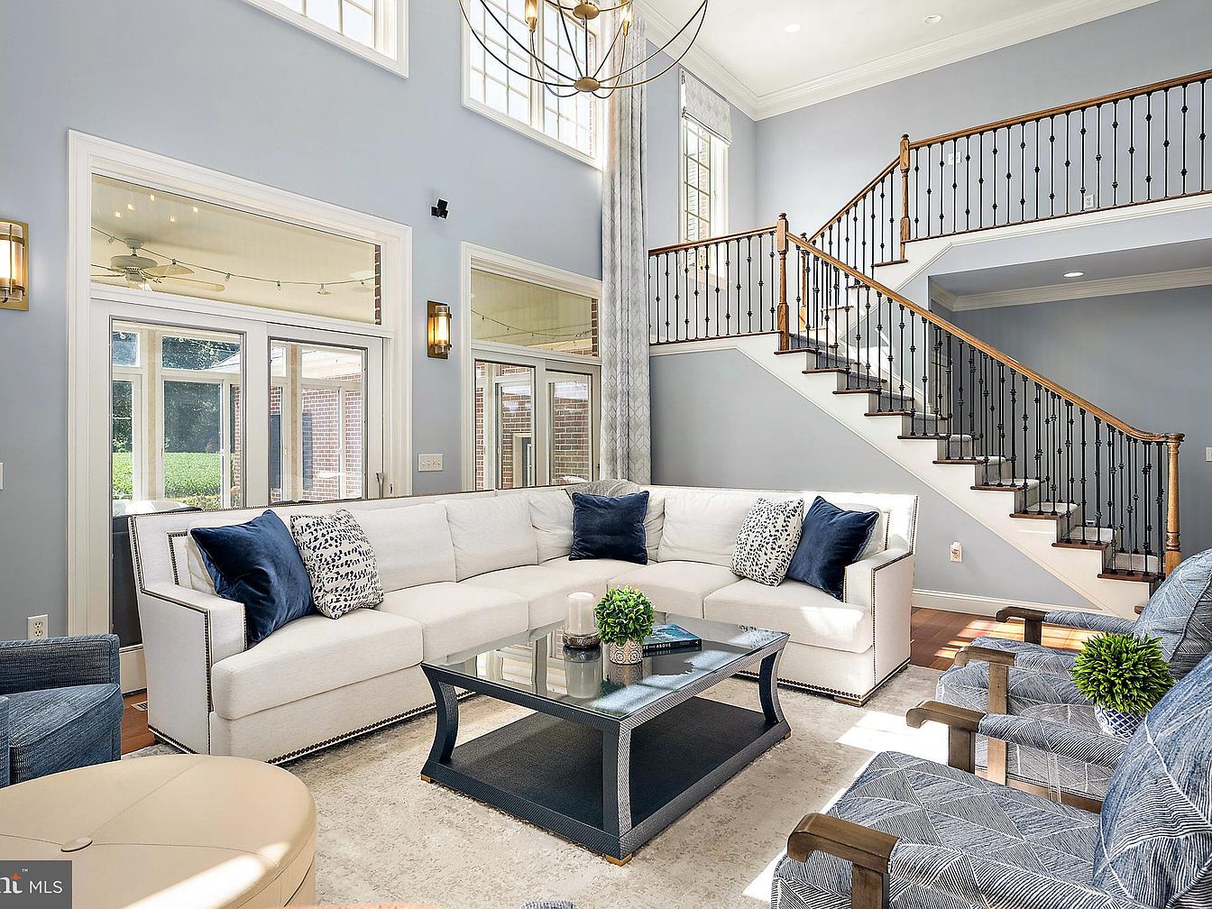 This spacious living room features an open layout characterized by high ceilings and large windows, enhancing natural light. Soft blue walls create a tranquil ambiance, complemented by white and navy accents in the furniture. A large, white, sectional sofa houses plush navy throw pillows, while contrasting grey armchairs on the opposite side add visual interest. A sleek, dark coffee table centers the seating area, adorned with decorative items. The elegant staircase showcases rich wooden railings with black wrought iron spindles, leading to an upper level. Subtle light fixtures contribute to the sophisticated aesthetic of this charming space.