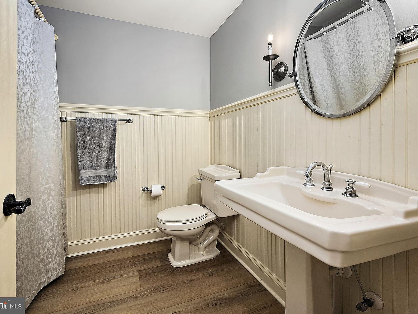 This charming bathroom features a combination of classic and modern elements. The walls are adorned with a light gray upper section paired with a wainscoting-style cream paneling below, providing a soft, airy feel. A round mirror above a vintage-style sink complements the polished chrome fixtures, adding elegance. The sink is uniquely designed with a wide basin, delivering a nostalgic touch. A towel rack displays a plush gray towel, enhancing the room’s color palette. The flooring consists of warm wood laminate, while a shower curtain introduces texture and pattern. Overall, the space feels cozy yet refined.