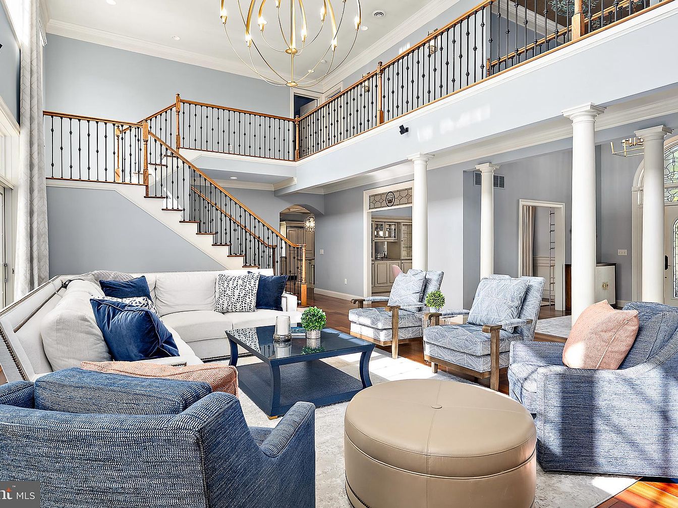 The spacious living room features high ceilings adorned with a modern chandelier and ample natural light from expansive windows. Soft blue walls complement a white sectional sofa, accented with plush navy and patterned throw pillows. A round ottoman in taupe adds a contrasting color, while a sleek black coffee table anchors the seating area. Two patterned armchairs with wooden frames provide additional seating. The staircase showcases elegant wood railings and spindles leading to an upper level, enhancing the room’s vertical space. Architectural columns add classic charm, harmonizing with the overall contemporary aesthetic of the space.