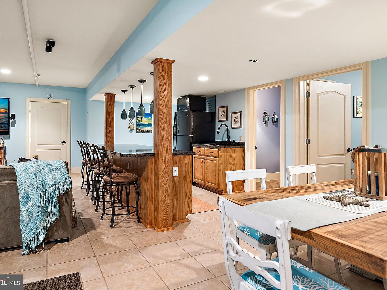 A cozy dining area integrates with the open layout of the home. Light blue walls create a calming ambiance, complemented by warm wooden accents. A large rectangular dining table, accented with a simple table runner, is surrounded by white chairs featuring blue coral patterns. To one side, a sleek kitchen area includes oak cabinetry and black countertops, maintaining a modern yet rustic appeal. Bar stools line the countertop, inviting casual dining or social interaction. Pendant lights hang above, providing focused illumination. The tiled floor enhances the space’s functionality, while decorative artwork adds character to the room.