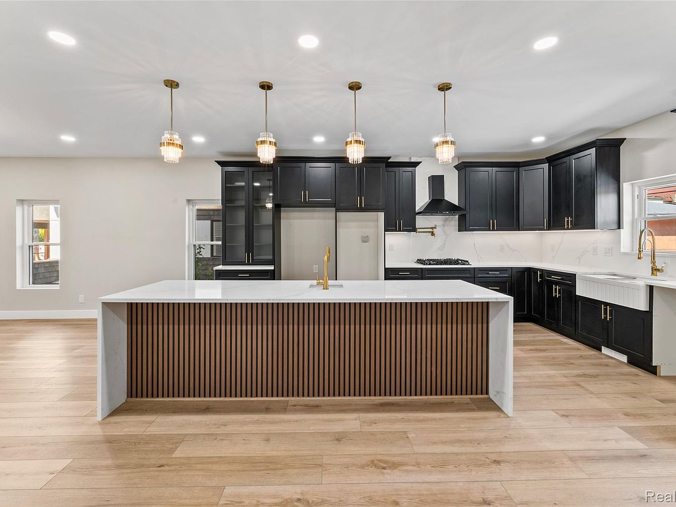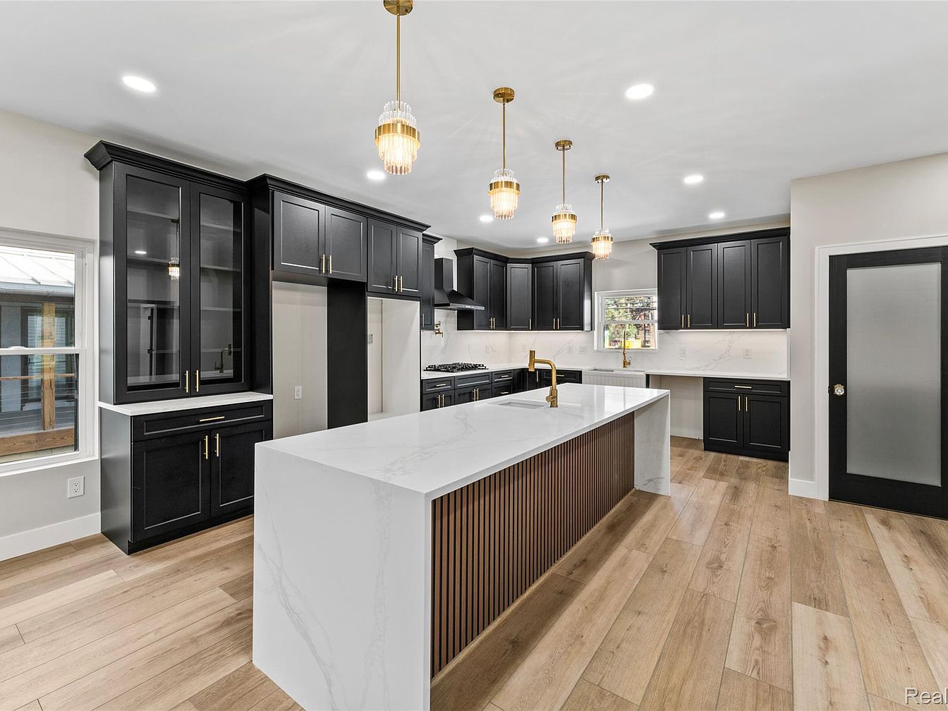 This modern kitchen showcases a spacious layout highlighted by an expansive central island featuring a sleek white countertop and a unique wooden-slatted front. Dark cabinetry contrasts elegantly with the light-colored floor, accentuating a contemporary aesthetic. Warm gold fixtures, including pendant lights and a faucet, add a touch of luxury. The backsplash features subtle veining, complementing the countertops, and providing a sense of depth. Abundant natural light filters through the windows, enhancing the open feel of the design. The seamless integration of appliances and storage solutions reflects a perfect balance of style and functionality, making it both inviting and efficient.