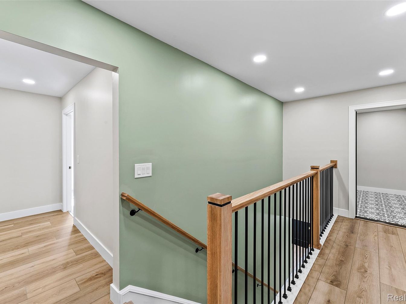 This space showcases a modern hallway with a calming color palette. Soft green walls provide a fresh contrast against the light grey elements. A sleek wooden handrail with black metal balusters complements the hardwood flooring, which exhibits a warm tone. The flooring’s horizontal planks create a sense of spaciousness, leading the eye down the hall. Recessed ceiling lights illuminate the area effectively, highlighting the minimalist aesthetic. An open doorway hints at adjacent rooms, with a patterned tiled floor visible beyond it, adding texture and interest. The overall design exudes a contemporary yet inviting atmosphere.