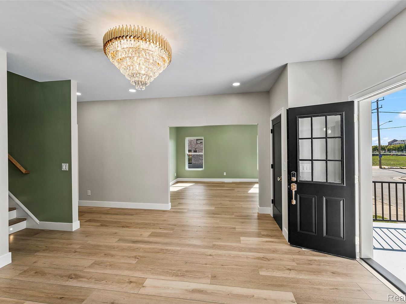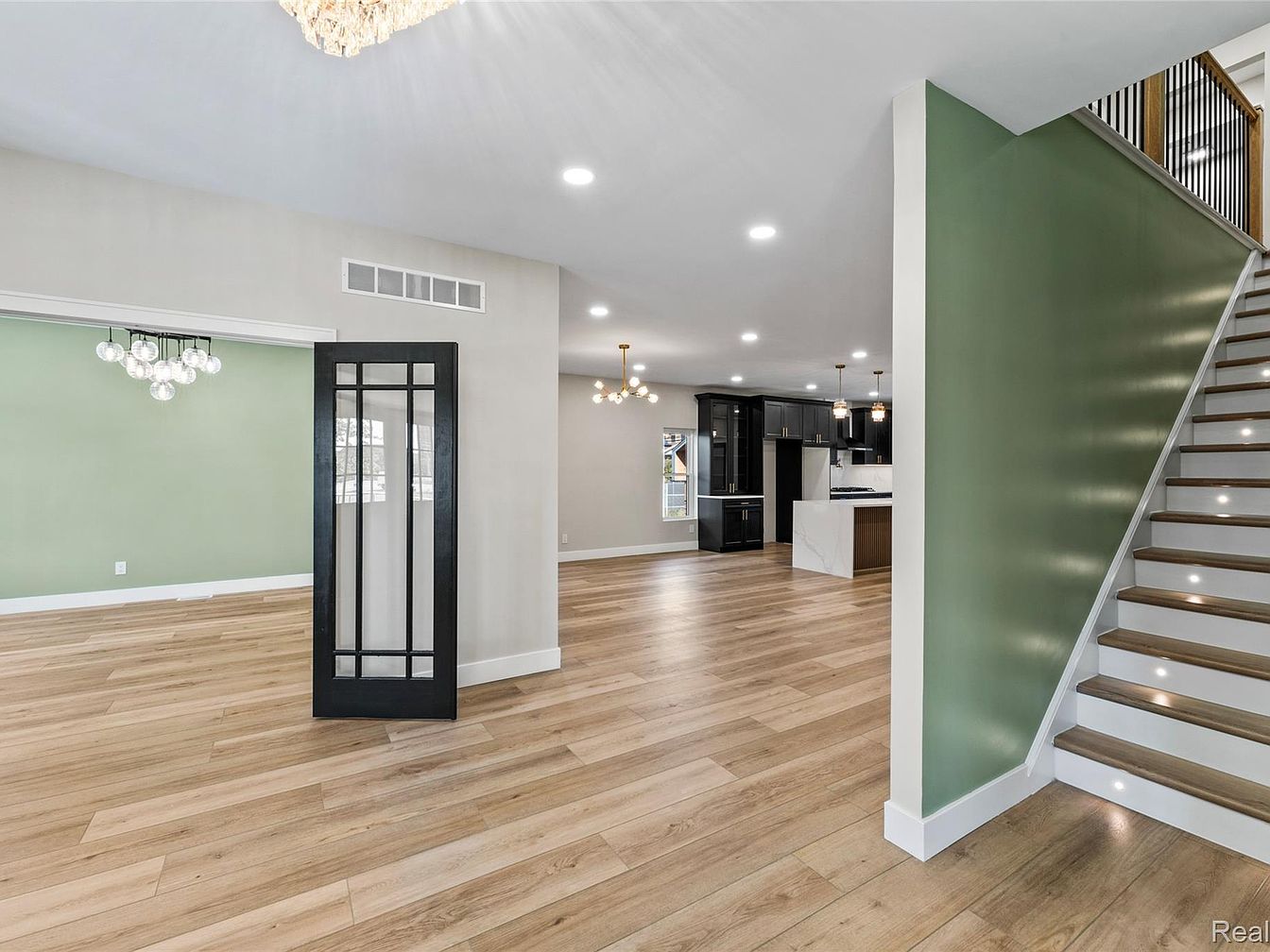 This spacious entryway features a striking chandelier that provides elegance and ample lighting. Soft green walls contrast with the light gray tones, creating a fresh ambiance. The flooring is a warm, natural wood, which extends into the adjoining spaces, enhancing continuity. To the left, a staircase with a wooden banister leads to the upper level, adding architectural interest. The front door, painted black, includes detailed glass panels, inviting light and views from outside. A large opening to the adjoining room allows for easy flow, while ample natural light pours in through the windows, brightening the entire area.