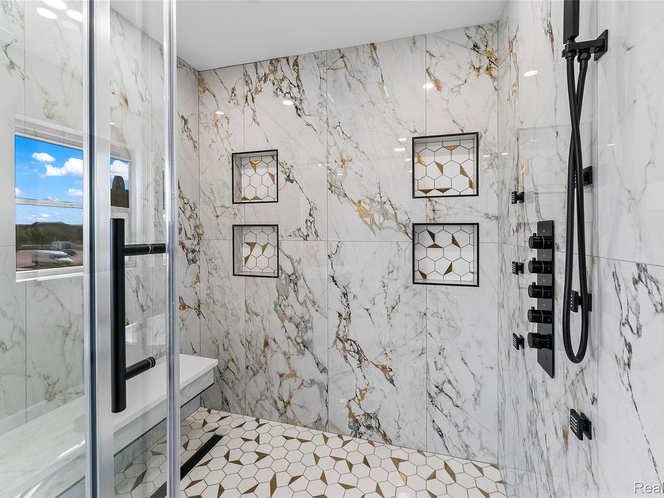 This luxurious bathroom shower features stunning marble walls with elegant veins of gold and green accents, creating a rich, sophisticated aesthetic. The textured marble contrasts beautifully with the modern hexagonal accent tiles, incorporating shades of white, gold, and beige on the floor. Frameless glass doors allow natural light to illuminate the space while showcasing the intricate tile patterns. A sleek, black rainfall showerhead and matching controls add a contemporary touch, harmonizing with the dark elements of the design. Framed niches provide functional storage for bath essentials, enhancing the modern yet timeless appeal of this exquisite shower space.