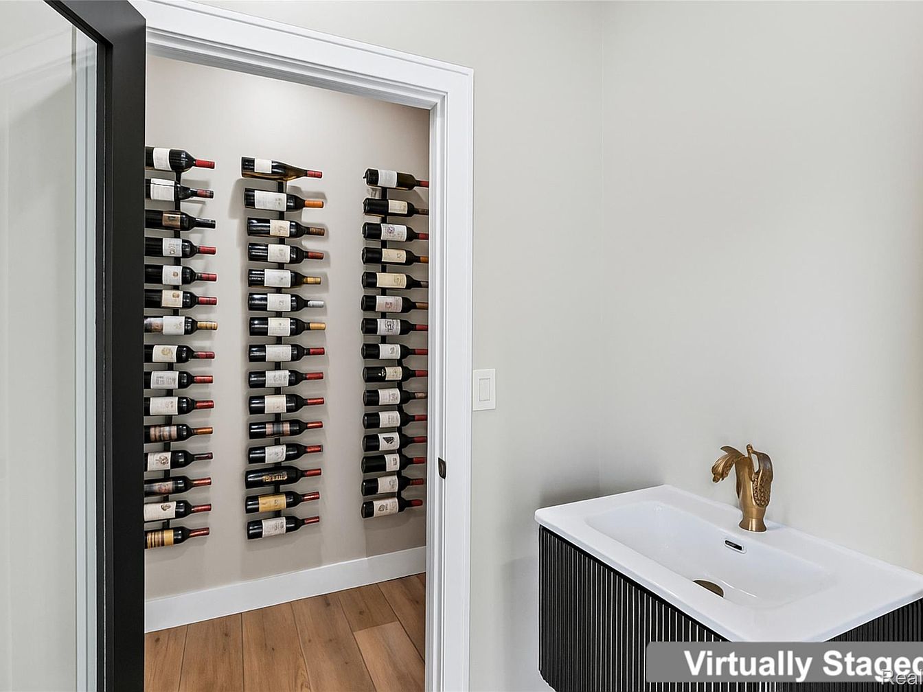 A stylish wine room features a meticulously arranged wall of wine bottles, each prominently displayed on sleek metal racks. The light-colored walls enhance the room’s bright ambiance, while warm wood flooring offers contrast and warmth. A modern sink with a unique bronze faucet, resembling a graceful swan, adds an artistic touch to the space. The geometric lines of the sink’s cabinetry, with its ribbed black surface, contribute to contemporary elegance. The combination of natural tones and contemporary accents creates a sophisticated atmosphere, perfect for wine enthusiasts who appreciate both form and function in their home decor.