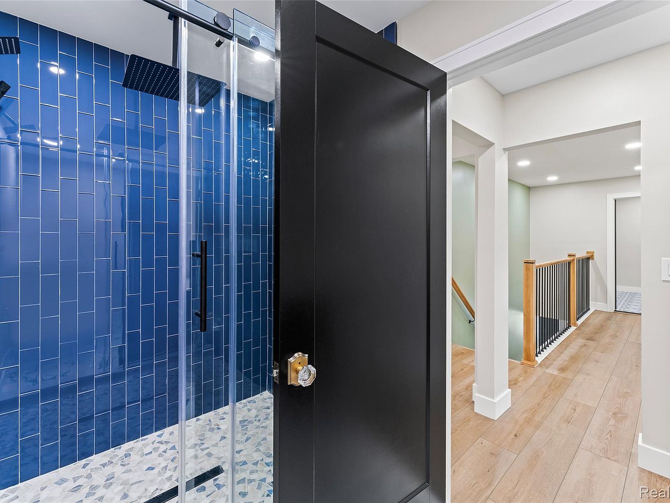 This image reveals the entrance to a modern bathroom, featuring a striking blue tiled wall. The tiles are rectangular, arranged in a vertical pattern, and create a vibrant backdrop for the space. A glass sliding door adorned with sleek black hardware leads into the shower area, emphasizing a contemporary aesthetic. The floor showcases a unique mosaic design with smooth, rounded stones, enhancing the spa-like ambiance. Adjacent to the bathroom, a glimpse of a light-filled hallway is visible, with a muted green wall and wooden railings, blending warmth into the overall crisp and sleek design.
