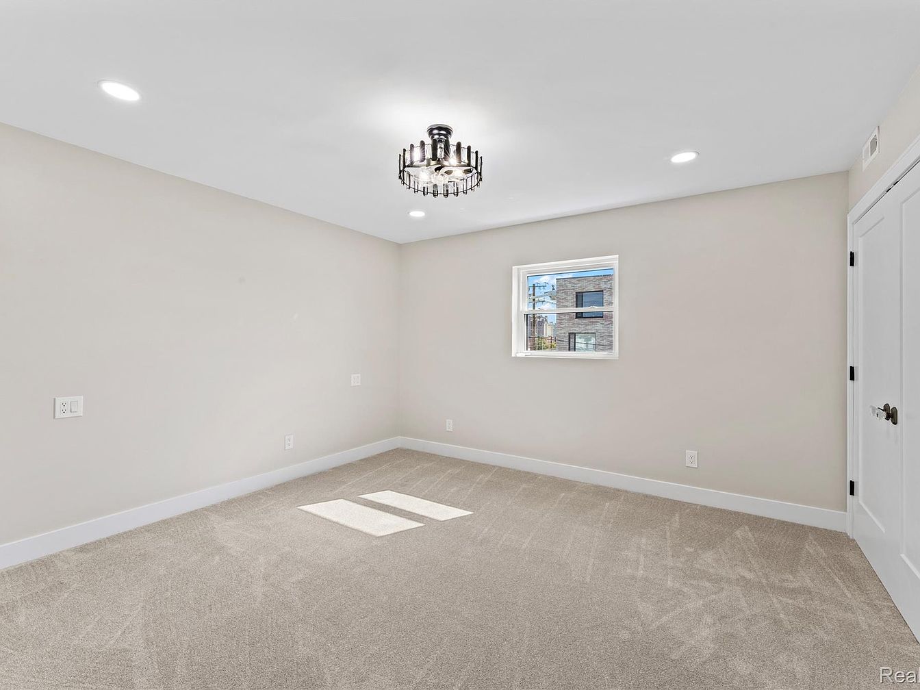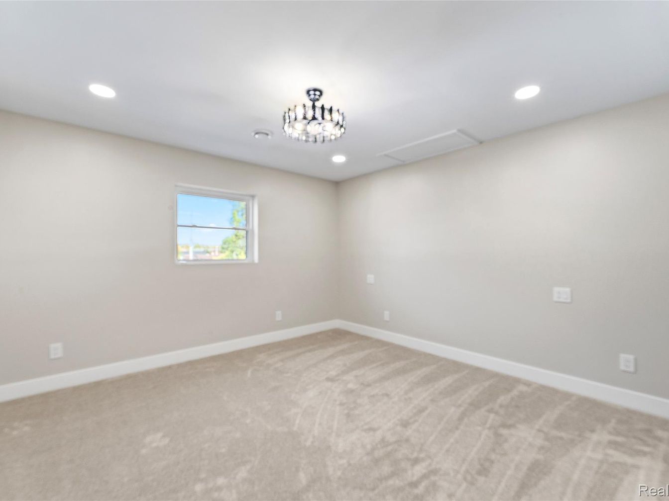 This room features a soft, neutral color palette with light beige walls, creating an inviting ambiance. A plush, light gray carpet covers the floor, contributing to a cozy feel. Illuminated by both a modern chandelier and recessed lighting, the space is well-lit and warm. A single window allows natural light to filter in, enhancing the openness of the room. The simple, classic white door and trim add to the contemporary aesthetic. The layout is clean and uncluttered, perfect for a serene bedroom environment, providing a blank canvas for personal decoration and furnishings.