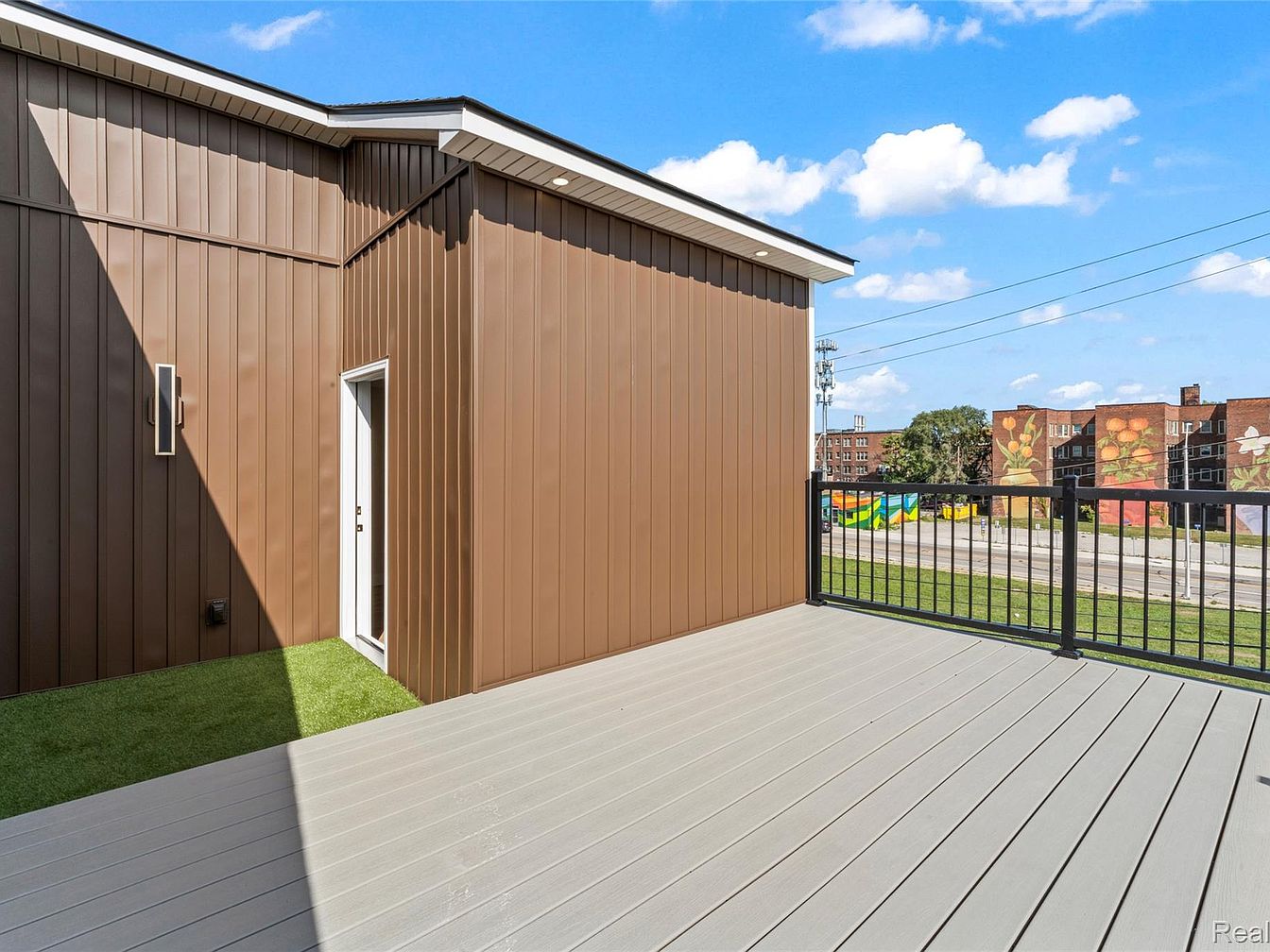 This outdoor terrace features a sleek, modern design highlighted by a light gray composite deck. The walls are clad in a rich, dark brown material, creating a striking contrast with the clear blue sky. A glass railing adds an unobstructed view, enhancing the spacious feel. To the right, a contemporary door leads into the home, flanked by a minimalist light fixture. Lush artificial grass complements the stark, clean lines of the terrace, providing a vibrant touch of greenery. The background showcases colorful murals on nearby buildings, adding urban charm and liveliness to the space.