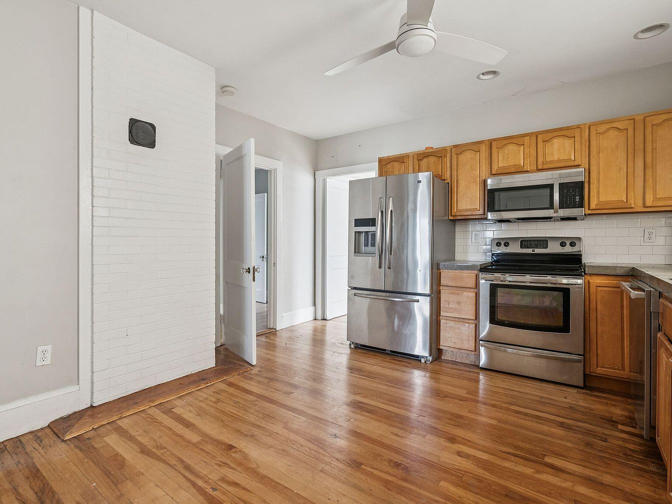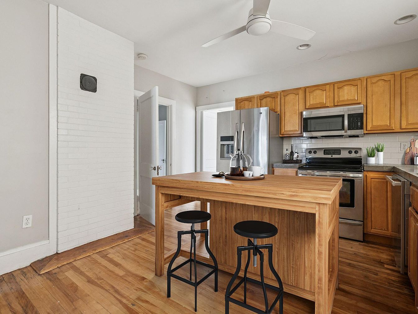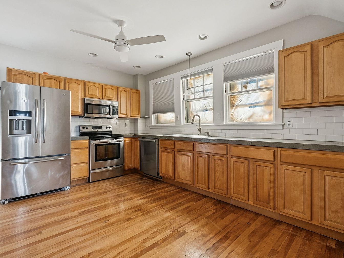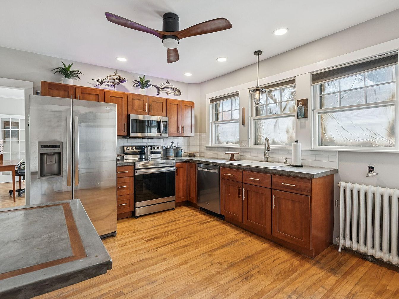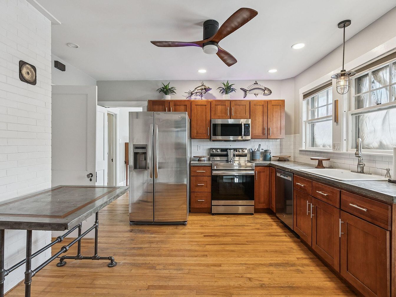 This spacious kitchen features warm wood cabinetry that complements the sleek, stainless steel appliances. The countertops boast a polished finish, enhancing the airy feel of the room, while the light wood flooring adds warmth. Large windows allow natural light to flood the space, showcasing the white subway tile backsplash. A ceiling fan circulates air, ensuring a comfortable cooking environment. The layout is efficient, with ample storage and counter space, making it ideal for both casual dining and meal preparation. The overall aesthetic is a blend of modern functionality with a touch of rustic charm.