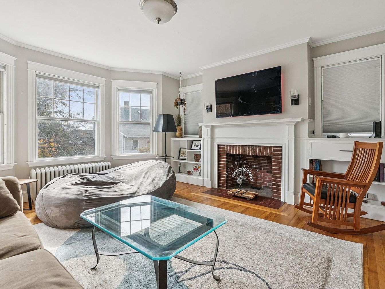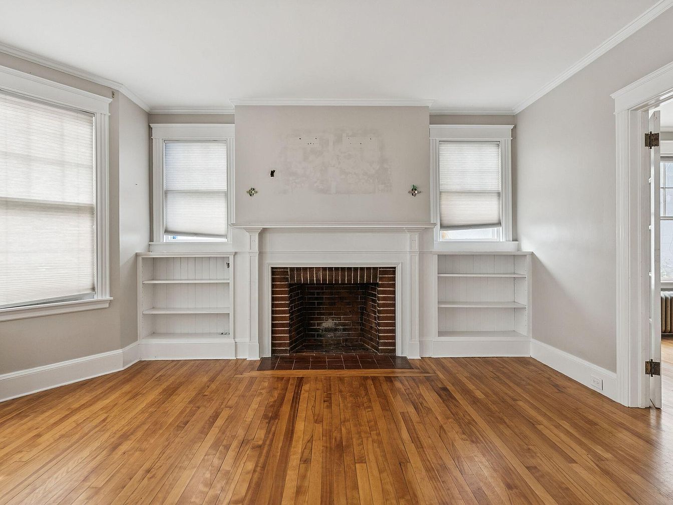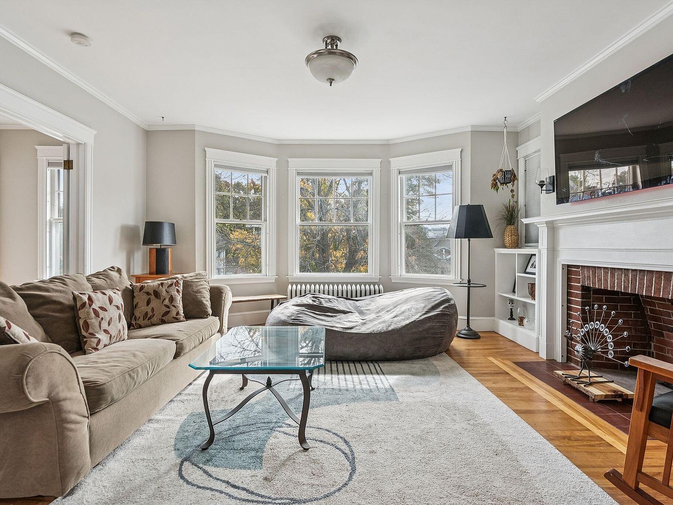 This living room features a spacious layout with natural light pouring in through large bay windows. The walls are painted a soft gray, providing a calming backdrop to contrasting white trim and moldings that accentuate the room’s height. A charming brick fireplace anchors one corner, complemented by a polished wooden mantel. The floor is finished in warm hardwood, which enhances the room’s inviting atmosphere. Opposite the fireplace, a simple built-in shelf offers space for decor or books. The overall aesthetic blends classic architectural elements with a contemporary, airy feel perfect for relaxation.