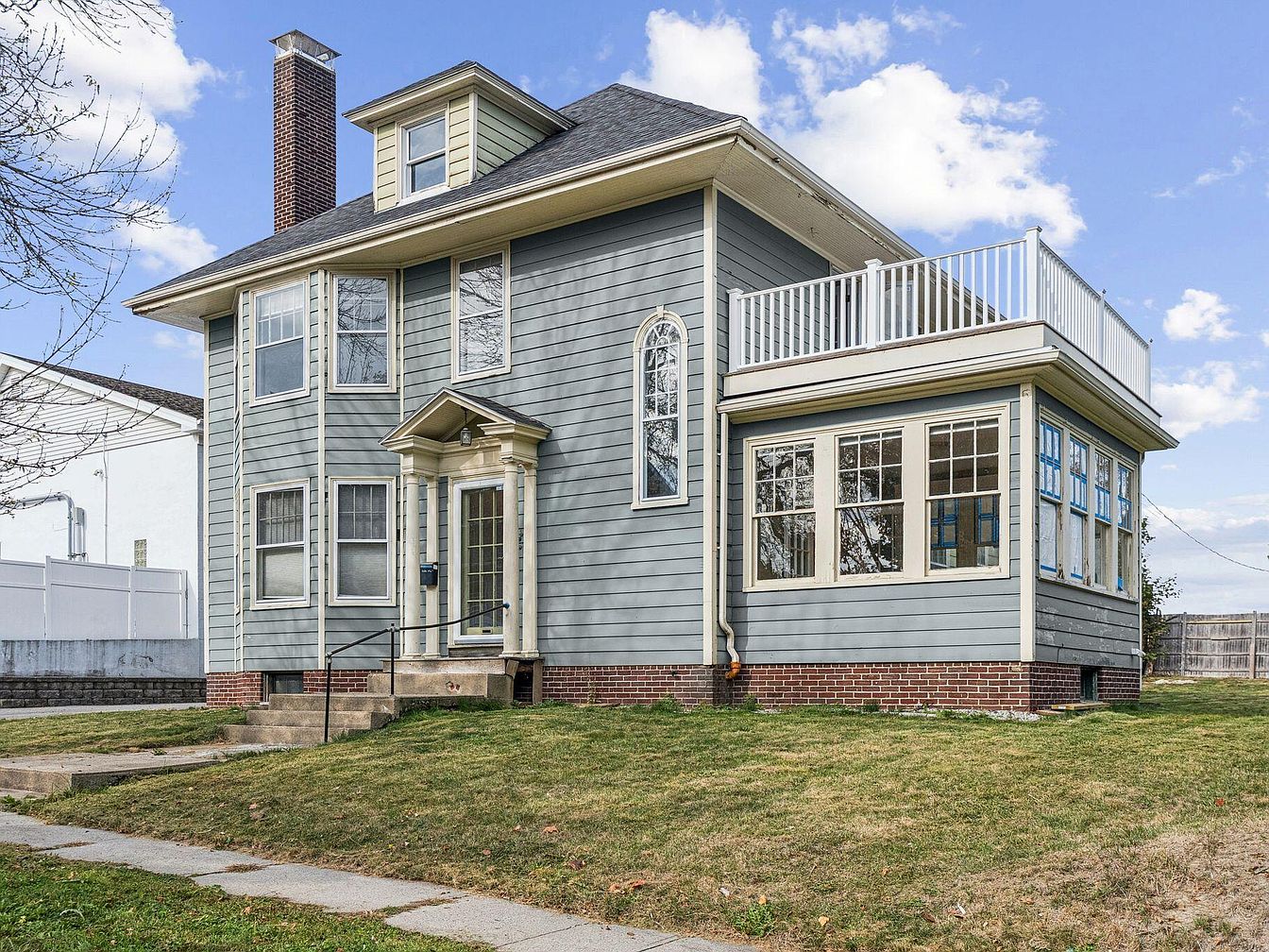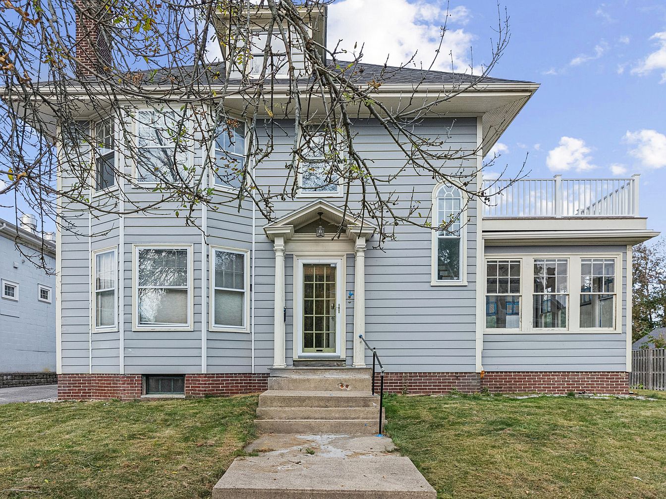The image showcases a historical American home with a distinct architectural style. The house features a combination of gray siding and a red brick foundation, creating a harmonious contrast. Notable elements include a unique arched window above the front entrance, framed by decorative trim. The sloped roof is accentuated by dormer windows, providing additional light to the upper level. A spacious balcony offers outdoor living space, accessible through multiple glass panel doors. The landscaped front yard is primarily grassy, bordered by a concrete walkway leading to the front steps, enhancing the inviting atmosphere of the property.