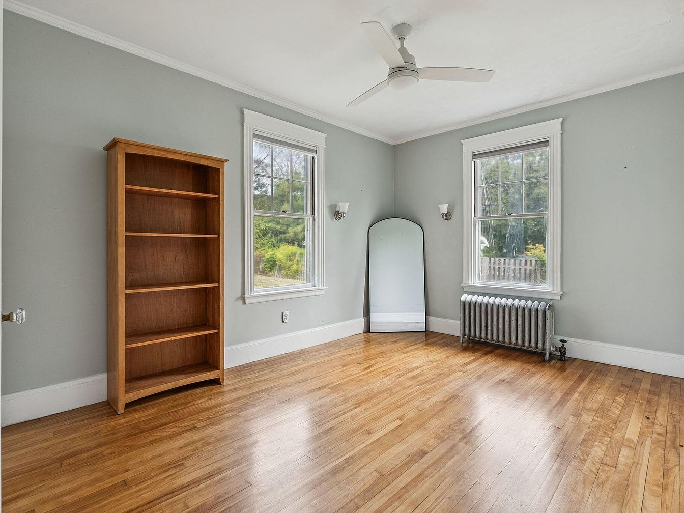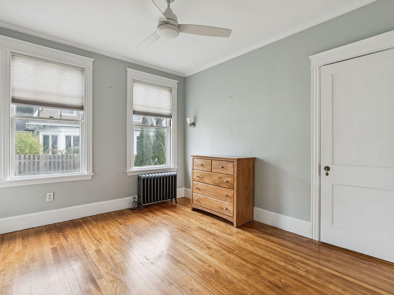 The room features a soft gray wall color, providing a calm and serene ambiance. Natural light floods the space through large, double-hung windows, framed by white trim. A wooden bookshelf stands against one wall, adding warmth with its rich brown finish. A sleek, full-length mirror leans beside the window, enhancing the room’s open feel. Opposite is a vintage-style radiator, showcasing old-world charm. The hardwood flooring boasts a warm, polished finish that complements the overall aesthetic. An overhead ceiling fan offers practicality while fitting seamlessly into the room’s minimalist design.