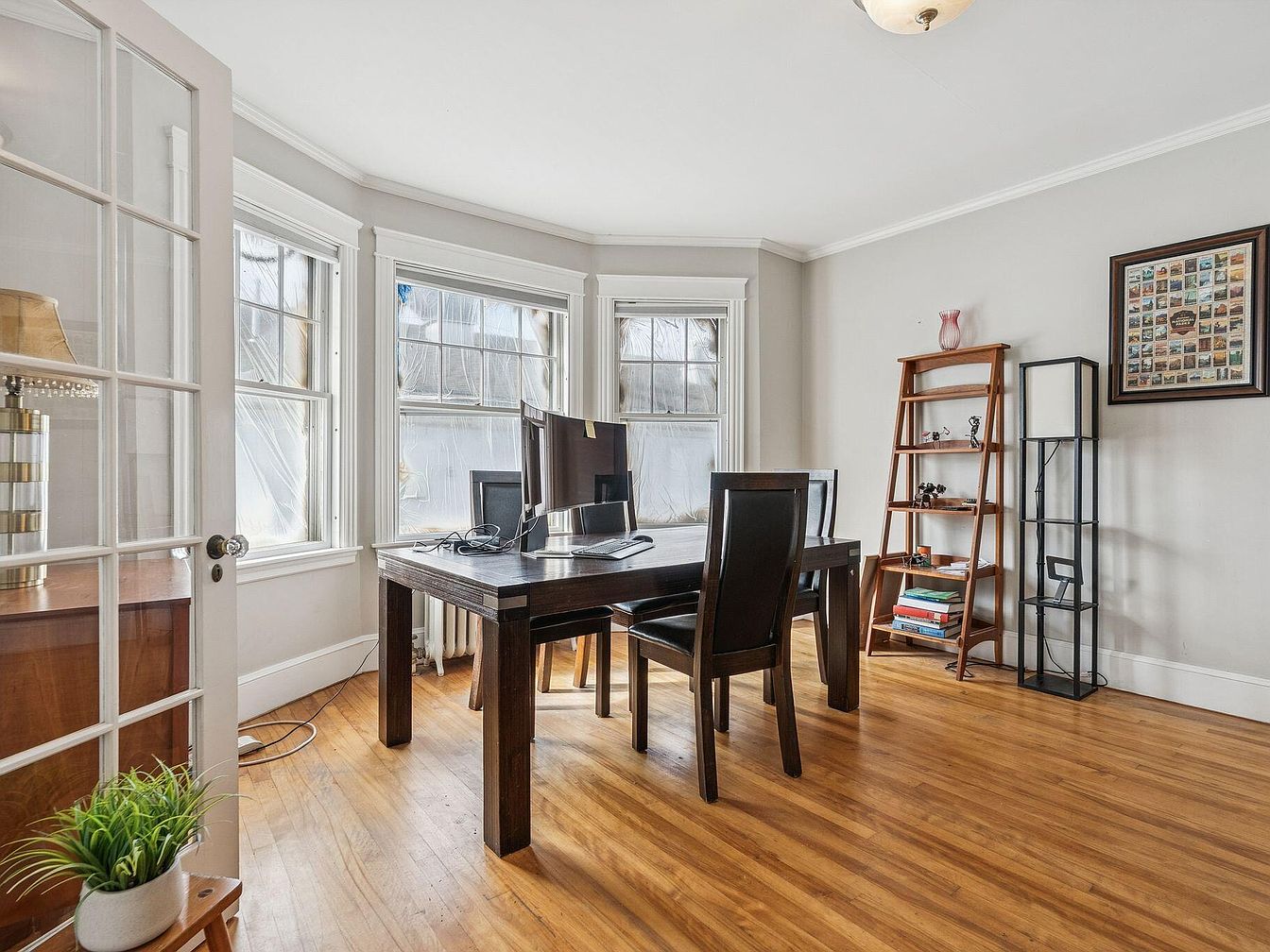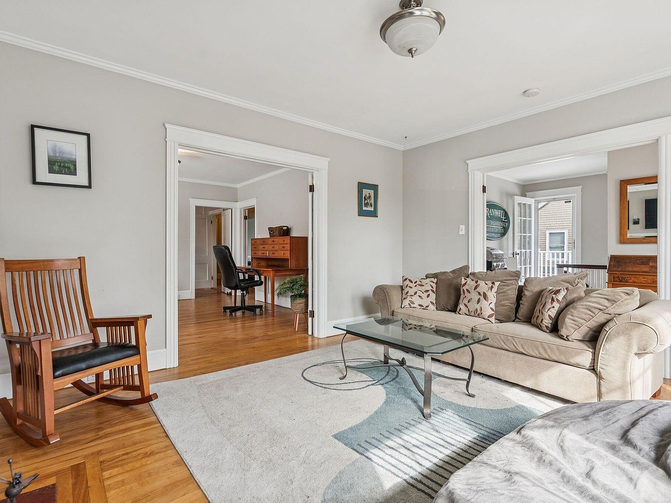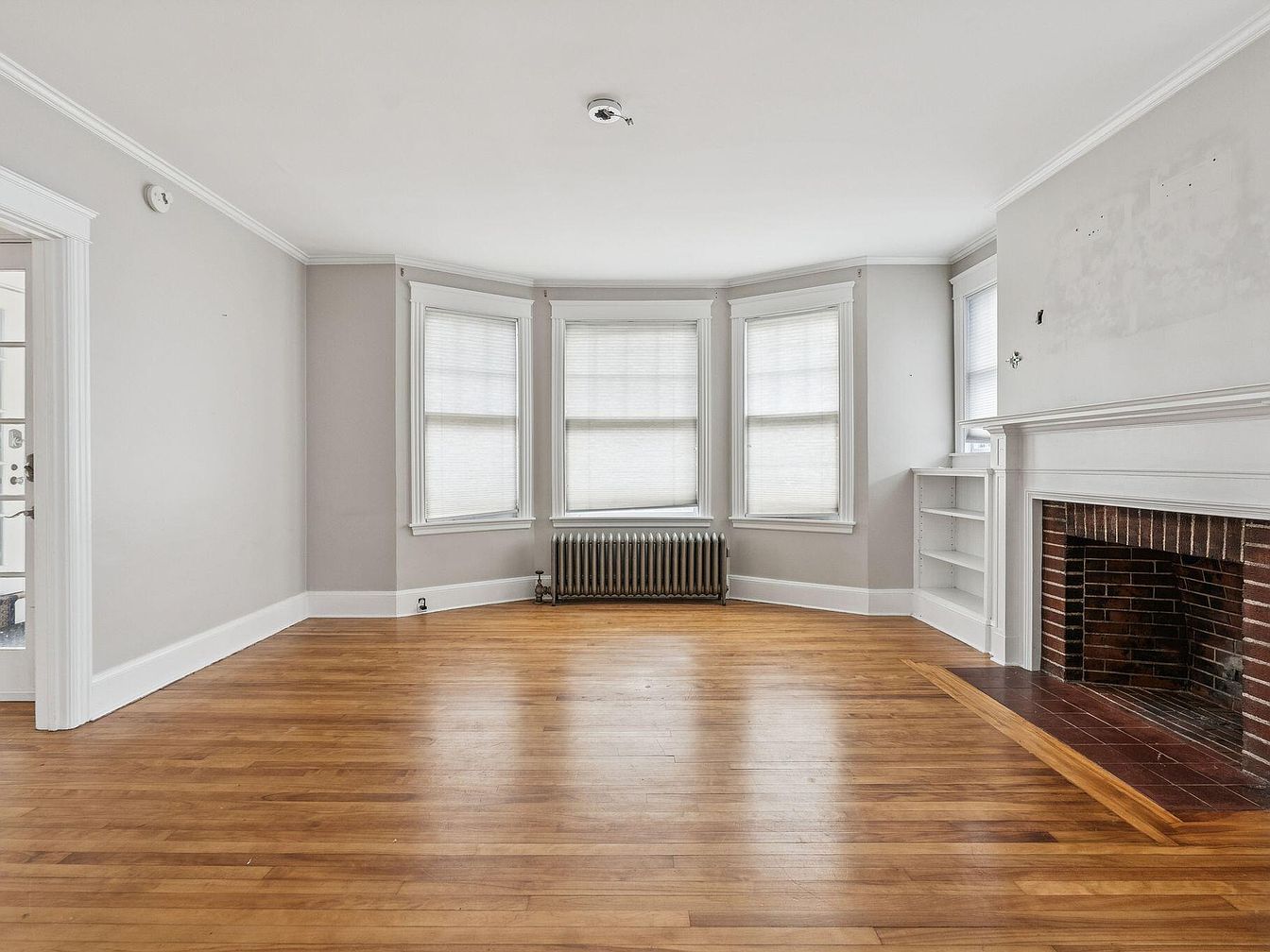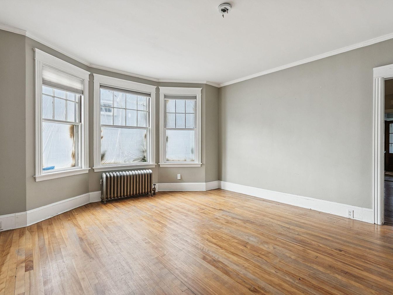 This living room features natural light streaming through three large, bay windows with classic white trim. The walls are painted in a soft, neutral gray that enhances the spacious feel of the room. A vintage, cast-iron radiator is positioned beneath the windows, adding both character and warmth. The hardwood floor showcases rich, warm tones of amber and honey, enhancing the room’s inviting atmosphere. Architectural details include crown molding along the ceiling and baseboards, while the open layout leads into adjacent spaces, promoting a seamless flow throughout the home. The overall aesthetic is timeless and simplistic.