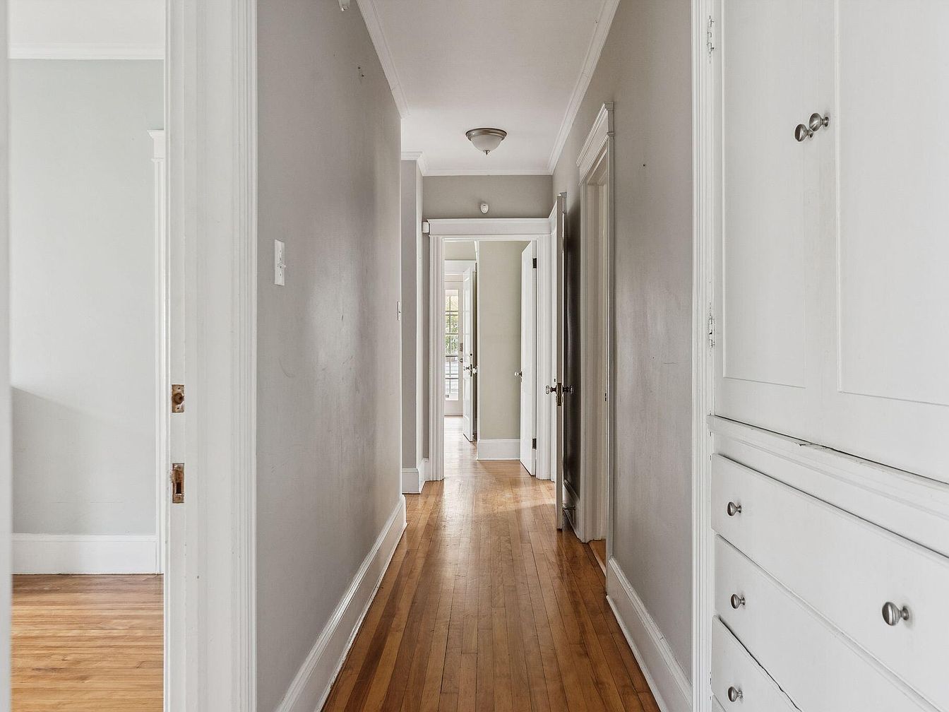 The hallway features a narrow, elongated layout with warm, polished hardwood floors and soft gray walls that enhance the light from the adjacent rooms. Light fixtures mounted on the ceiling provide illumination, keeping the space bright and inviting. Doors line both sides, framed with white moldings, including a built-in cabinet with sleek silver handles for storage. A door at the far end hints at an opening to an outdoor area, creating a seamless flow. The neutral color palette complements the classic architectural elements, showcasing a blend of functionality and traditional charm in the home’s design.