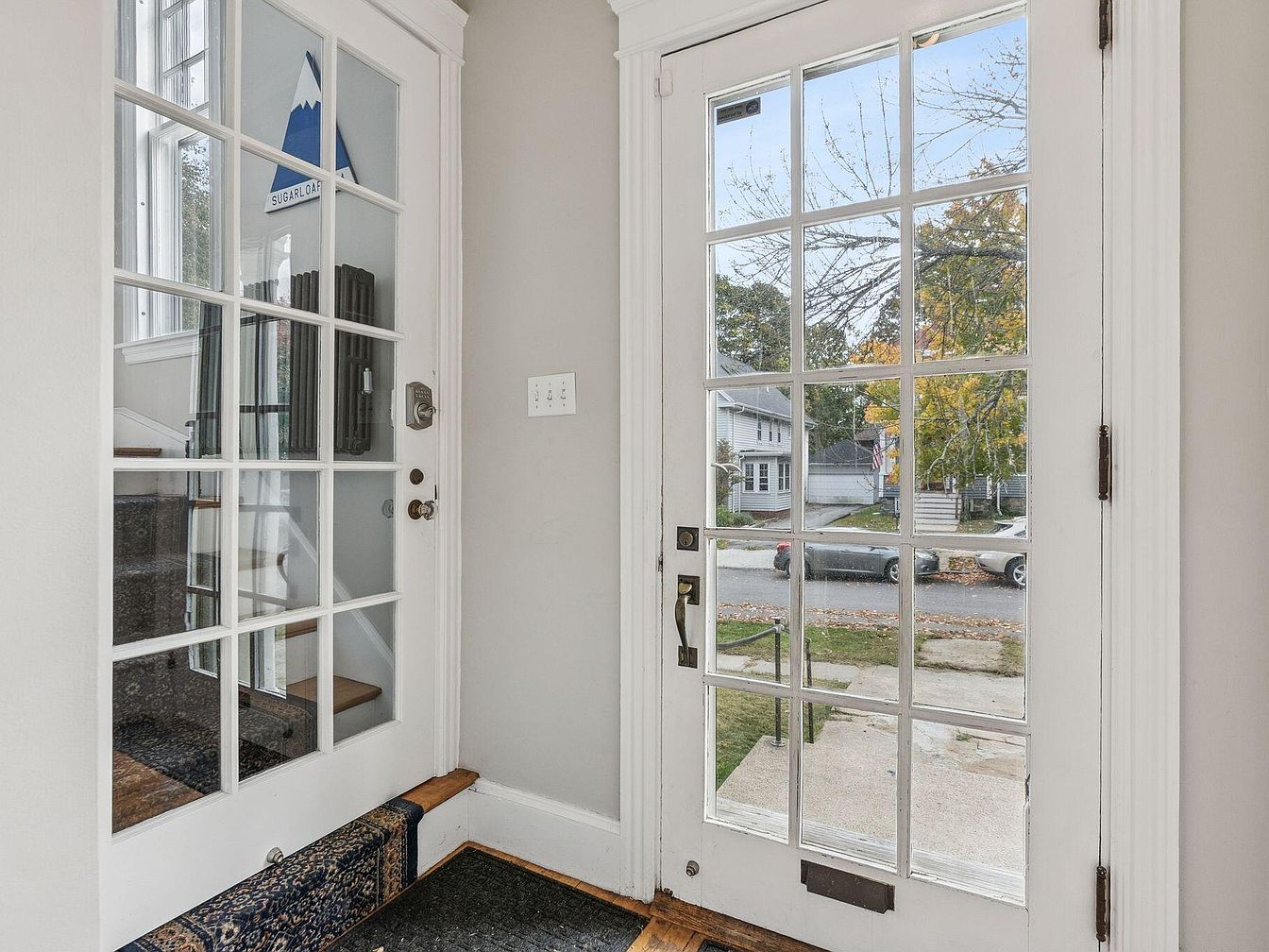 This entryway features elegant double doors with glass panes, offering a welcoming view of the outdoors. The surrounding walls are painted in a soft, neutral grey, enhancing the airy ambiance. A dark, textured area rug lies below, adding depth and warmth to the hardwood floor. Directly ahead, wooden stairs lead up, creating a sense of openness. Natural light streams in through the sidelights, illuminating the space and highlighting the intricate details of the door design. The overall aesthetic is both inviting and refined, combining classic architectural elements with a touch of contemporary style.