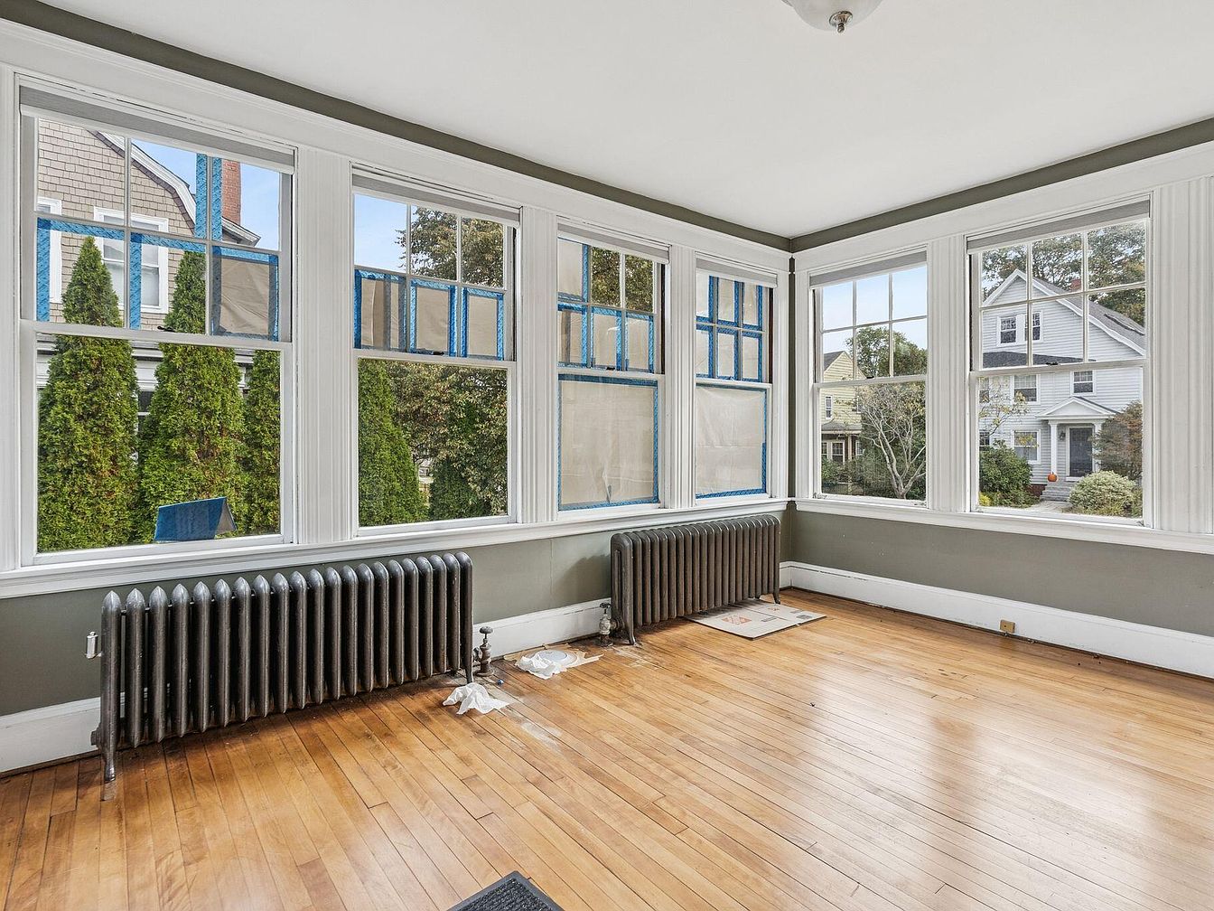 This sunroom features expansive windows that flood the space with natural light, creating a bright and airy atmosphere. The walls are painted in a soft gray, harmonizing with the warm wooden flooring, which showcases a polished finish. A dark metal radiator runs along the length of the room, providing a vintage touch. Framing the windows are delicate white moldings, enhancing the architectural charm. Outside, lush green trees are visible, adding a vibrant contrast to the neutral interior. Floorboards appear well-maintained, complementing the classic design elements that reflect the home’s historic character.