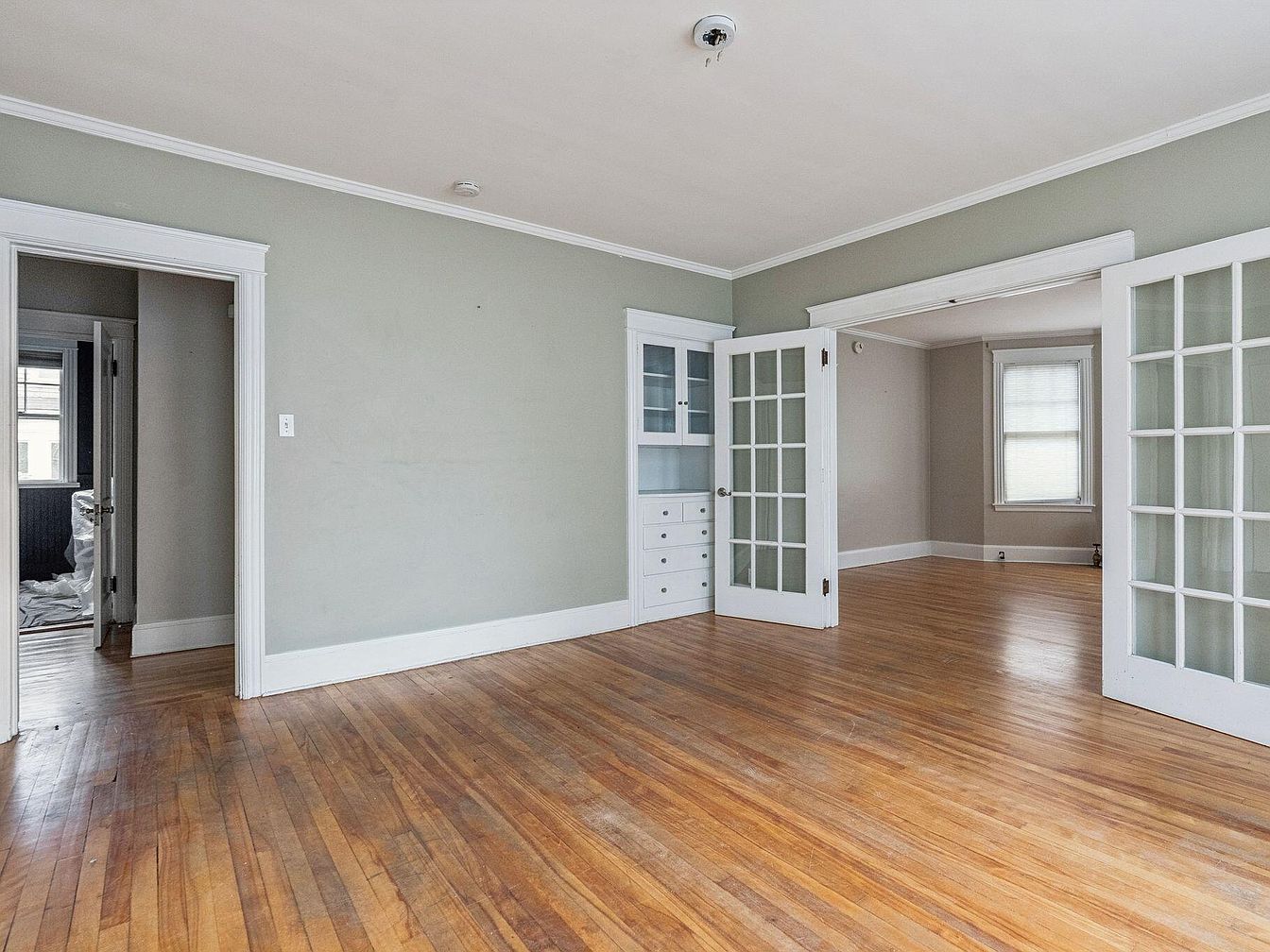 This spacious living room features hardwood floors that create a warm atmosphere. The walls are painted a subtle gray, complementing the white trim around doors and windows. French doors add charm and provide a transition to adjacent spaces. To the left, a built-in cabinet with multiple drawers offers functional storage, while large windows allow natural light to fill the room. The layout encourages an open feel, ideal for gatherings. Architectural details such as the ceiling crown molding enhance the historic character, while the neutral color palette allows for easy decor integration, making it a versatile and inviting space.