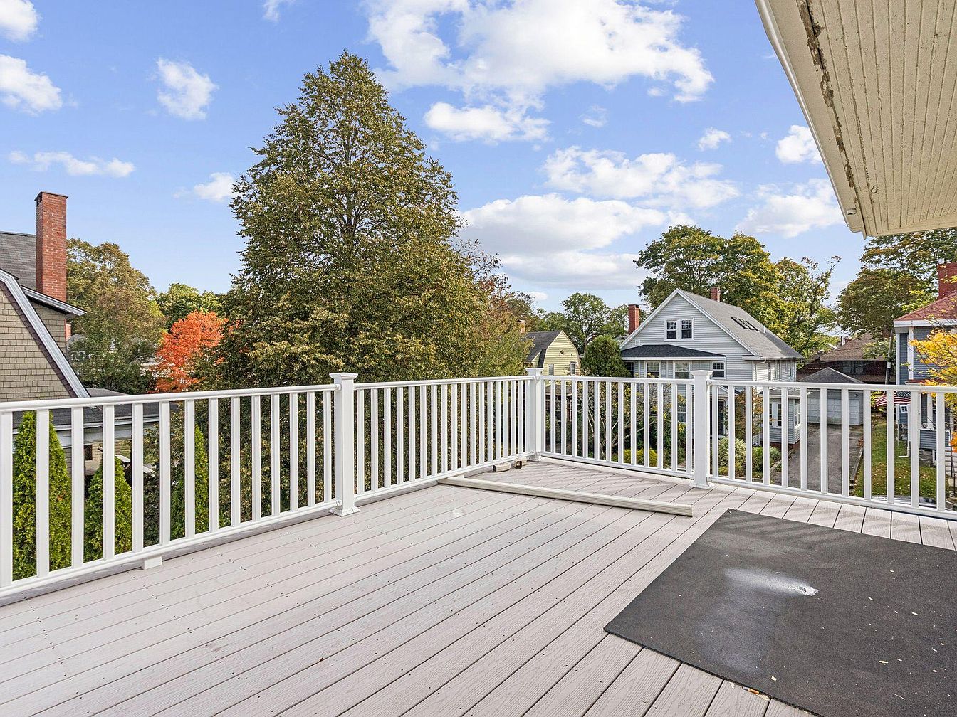 A spacious deck offers an expansive view of the surrounding neighborhood, framed by lush trees displaying vibrant autumn colors. The deck features light-colored wooden flooring, complemented by a white railing, enhancing the airiness and accessibility. The open space provides ample room for outdoor furniture, ideal for relaxation. Architectural details include a subtle overhang from the roof overhead, creating a defined area while allowing natural light to penetrate. In the background, quaint houses and blooming greenery complete the serene scene, making it an inviting spot for enjoying sunny days or cool evenings.