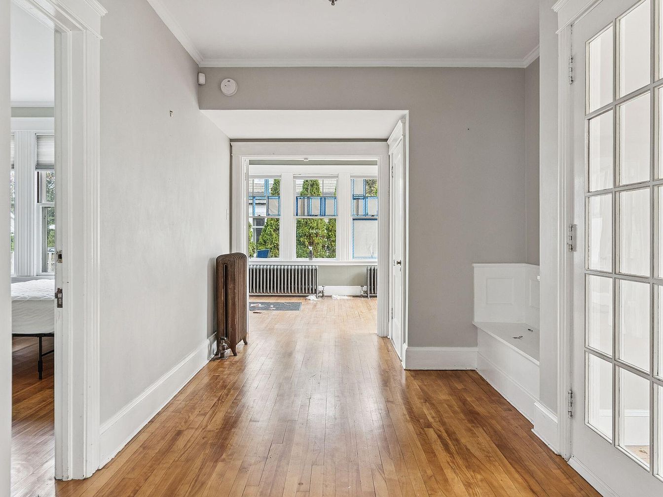 A spacious hallway features warm wood flooring that stretches toward the background, creating an inviting atmosphere. The walls are painted a soft, neutral gray, providing a contemporary backdrop for classic architecture. To the right, large glass-paned doors offer a glimpse into the light-filled adjacent room, while the left side reveals a doorway leading into another space. A vintage radiator with a wooden cover stands against the wall, adding character and warmth. Natural light floods through windows framed in white, accentuating the clean lines of the moldings and the overall airy feel of the home.