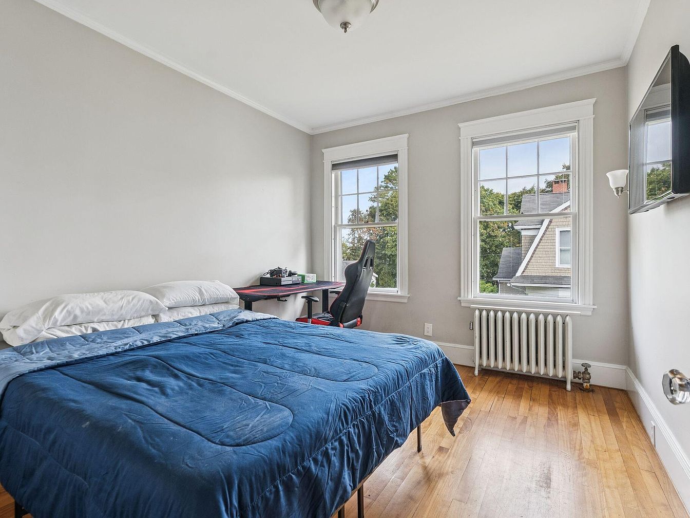 This bedroom features a serene layout with a large bed covered in a navy blue comforter, set against a muted beige wall. Two tall windows frame the space, allowing ample natural light and offering views of the neighborhood. A sleek black desk occupies one corner, paired with an ergonomic chair, while a flat-screen TV is mounted on the adjacent wall. A vintage-style radiator adds character, sitting beside warm hardwood flooring that enhances the room’s cozy feel. The crown molding above subtly highlights the room’s height, contributing to an inviting atmosphere perfect for relaxation or productivity.