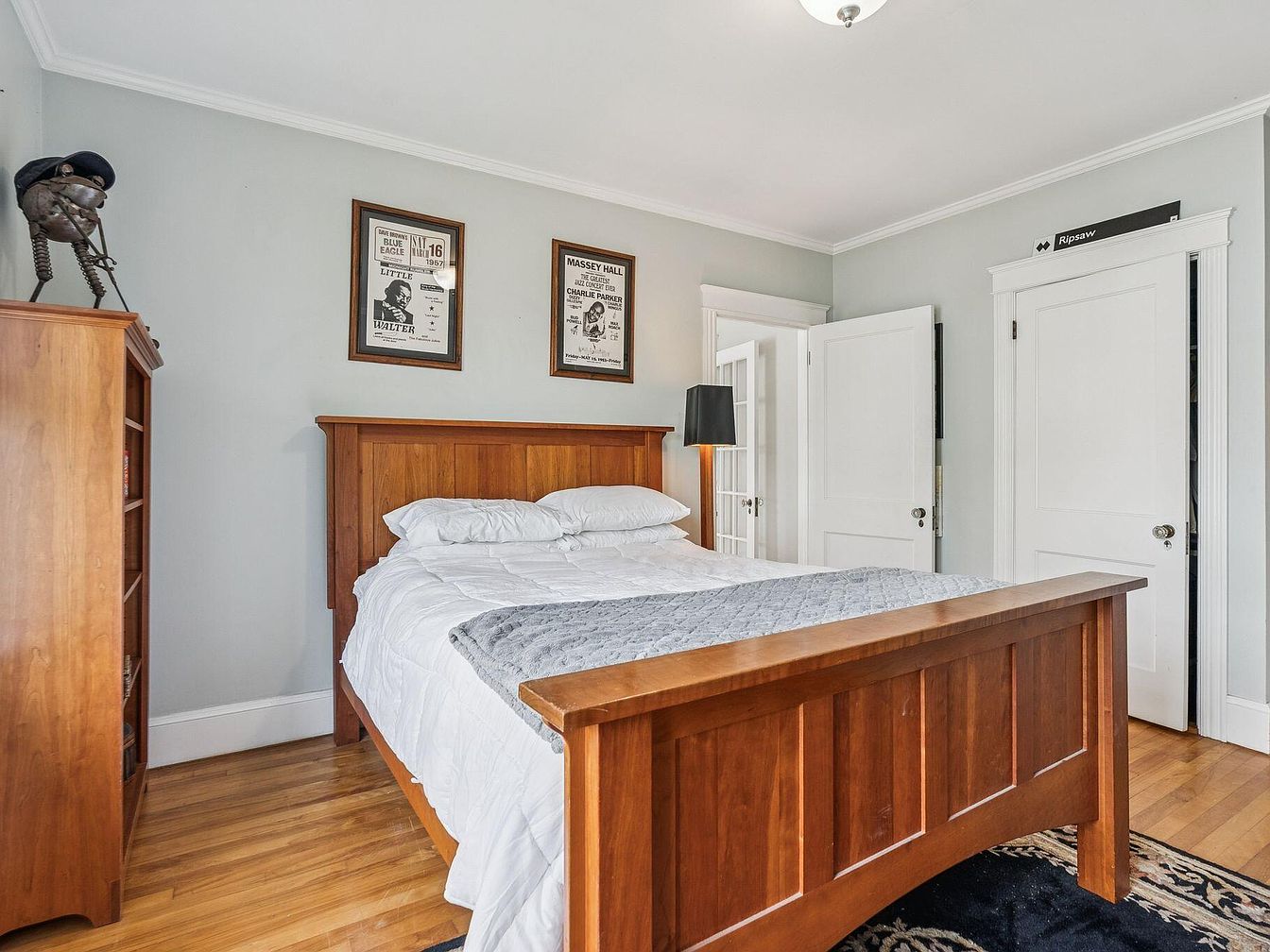 This cozy bedroom features a warm wood bed frame with a rich, dark finish. Walls are painted a soft gray, enhancing the space’s calmness. The bed is neatly made with white linens and a gray throw blanket, creating contrast. A wooden bookshelf stands to the left, filled with books, and adds a homely touch. Above the bed, vintage posters are framed, contributing character and a hint of nostalgia. A black lamp sits on a small bedside table, providing additional lighting. Two doors lead to the adjoining spaces, while hardwood floors add warmth and elegance to the room.