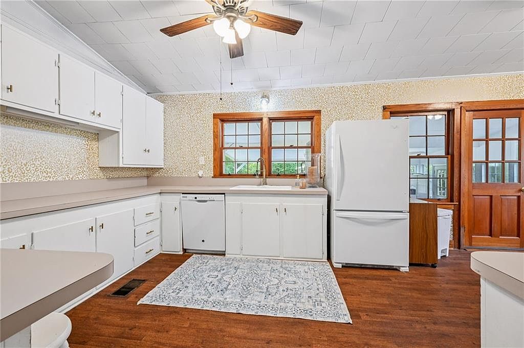 This kitchen showcases a functional layout with an abundance of white cabinetry paired with gold hardware, providing a clean and modern aesthetic. The countertops are light-colored, and a vintage-style rug adds warmth and comfort to the space. Large windows with wooden frames allow natural light to flood in, enhancing the inviting atmosphere. A ceiling fan hangs from a textured ceiling, while essential appliances, including a white refrigerator and dishwasher, blend seamlessly into the design. The overall color scheme combines soft neutrals with wooden accents, creating a harmonious balance between classic charm and contemporary design.
