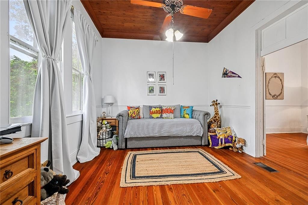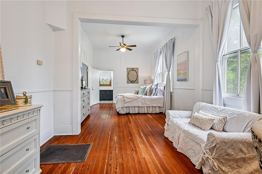 This space features a warm, inviting ambiance with rich, polished hardwood floors enhancing the charm. The walls are painted a soft white, complemented by large windows adorned with sheer, light gray curtains that allow natural light to flood the room. Prominently positioned is a cozy bed dressed in light linens, inviting relaxation. A plush couch draped in a light cover sits against one wall, embellished with decorative pillows for a touch of character. A tasteful dresser with vintage accents adds storage and style. The ceiling fan provides a practical yet decorative element, harmonizing with the serene decor.