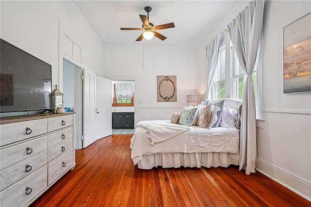 A cozy bedroom featuring a large bed adorned with neutral bedding and decorative pillows in soft hues. Light streaming through large windows brightens the space, which is complemented by white walls and high ceilings. An antique dresser with a weathered finish sits against one wall, topped with a television and decorative lantern. Wooden flooring adds warmth to the room, while a ceiling fan with wooden blades provides a rustic touch. Curtains in soft gray frame the windows, and a charming artwork piece hangs on one wall, tying the room’s serene aesthetic together.