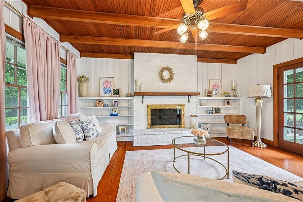 This cozy living room features a warm wood ceiling with exposed beams, enhancing the inviting atmosphere. The walls are clad in white paneling, providing a bright contrast to the rich reddish-brown hardwood floor. A chic white sofa adorned with blue patterned throw pillows invites comfort. A circular gold and glass coffee table sits on a soft area rug, surrounded by natural light from large windows draped with soft pink curtains. The focal point is a brick fireplace with a golden trim, complemented by tasteful decor on floating shelves, including framed photos and art, and a vintage-style lamp.