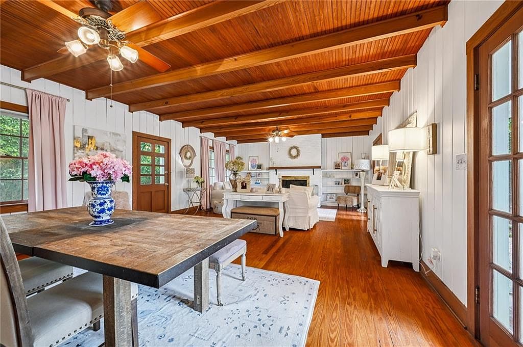 The room features a warm, inviting dining area seamlessly integrated into a cozy living space. Rich wooden beams define the ceiling, contrasting beautifully with the white shiplap walls. A robust, rustic wooden table sits at the center, adorned with a striking blue and white vase filled with pink flowers. Plush, upholstered chairs complement the table while a soft area rug adds texture. Natural light floods in through multiple windows, accentuated by pale pink drapes. A fireplace with whitewashed brick acts as a focal point across the room, flanked by elegant decor and well-placed lighting, enhancing the overall charm.
