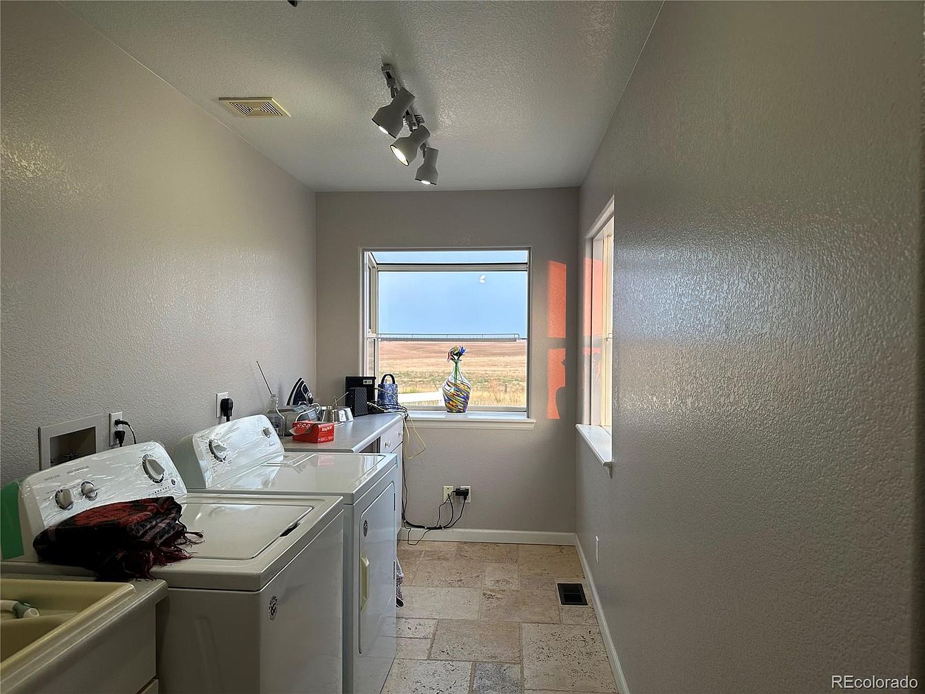 A long and narrow laundry room with a utilitarian layout features a washer and dryer side by side against a soft beige wall. Cream tile flooring adds texture, complementing the smooth, light-colored painted walls and white trim. There is a utility sink on the left, and countertops provide workspace for folding clothes. Overhead, a modern track light fixture with three adjustable lamps brightens the space. Two large windows, one at the end and one on the right wall, fill the room with natural daylight and offer clear views of the open landscape beyond, enhancing a feeling of openness and functionality.