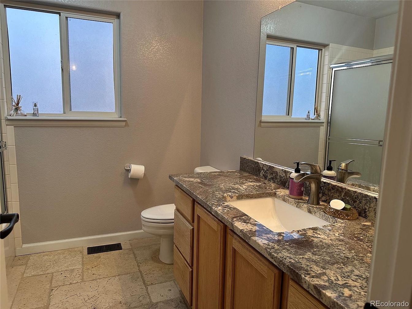 A functional bathroom space featuring a single sink set in a speckled granite countertop with natural brown and cream tones, resting on wood cabinetry. To the right, a large mirror reflects the area, adding depth to the room. The toilet is situated beside the vanity beneath a wide frosted glass window, which provides privacy while allowing natural light to filter in. Neutral beige walls and matching stone-look floor tiles create a clean, understated look. Metal fixtures in a brushed nickel finish add a modern touch, and sparse, uncluttered accessories maintain a tidy, minimalist aesthetic.