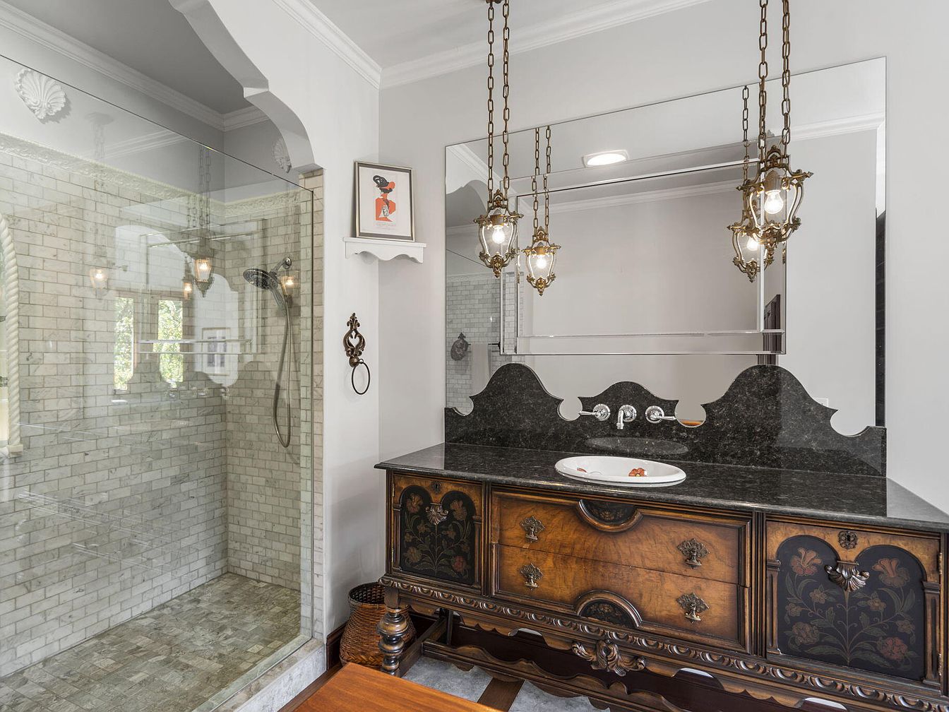 Elegant bathroom with a glass-enclosed shower featuring white subway tile, a rainfall showerhead, and generous natural lighting from large windows. The vanity area is adorned with a striking vintage-style wooden cabinet, topped with a polished black marble countertop and a white undermount sink. Ornate brass fixtures and pendant lights hang above the sink, providing a warm, ambient glow. The walls are painted a soft gray, creating a soothing atmosphere, and crown molding accents the ceiling for added architectural interest. Thoughtful details like spacious counters and low cabinetry ensure this space is both sophisticated and practical for everyday family use.