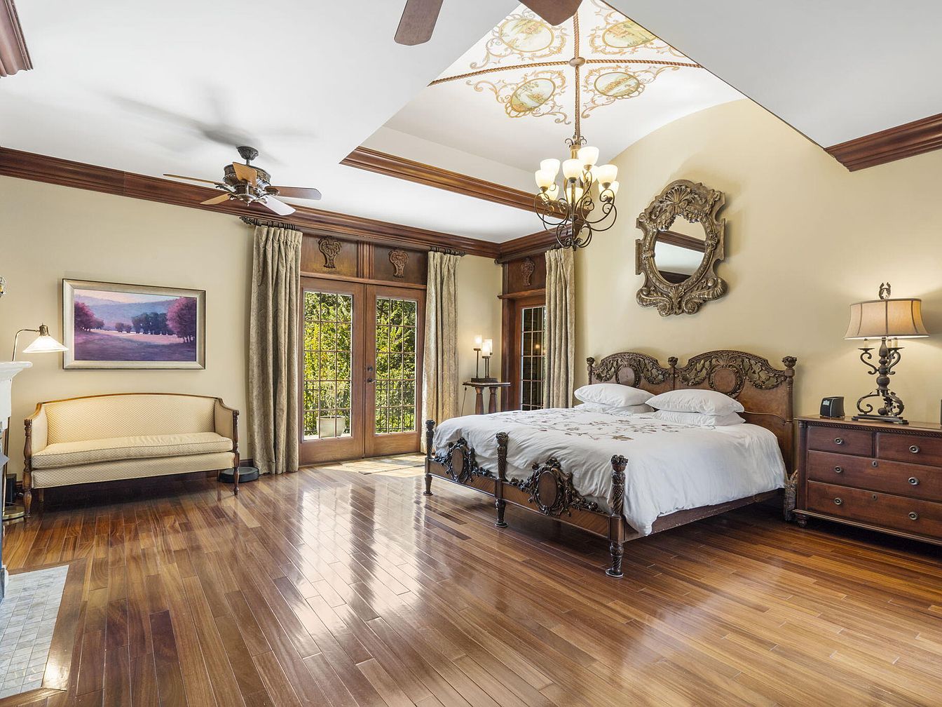 This spacious master bedroom features rich, polished hardwood floors and elegant cream-colored walls, paired with warm wooden crown molding and matching trim. The centerpiece is a grand, ornate wooden bed with intricate carvings, dressed in crisp white bedding. To the right, a classic wooden dresser supports a soft, ambient table lamp. Across from the bed, a cozy upholstered bench provides a quaint sitting area beneath a tranquil landscape painting. French doors open to natural views and bathe the room in sunlight through tall, draped curtains, fostering a serene atmosphere ideal for relaxation and family togetherness.