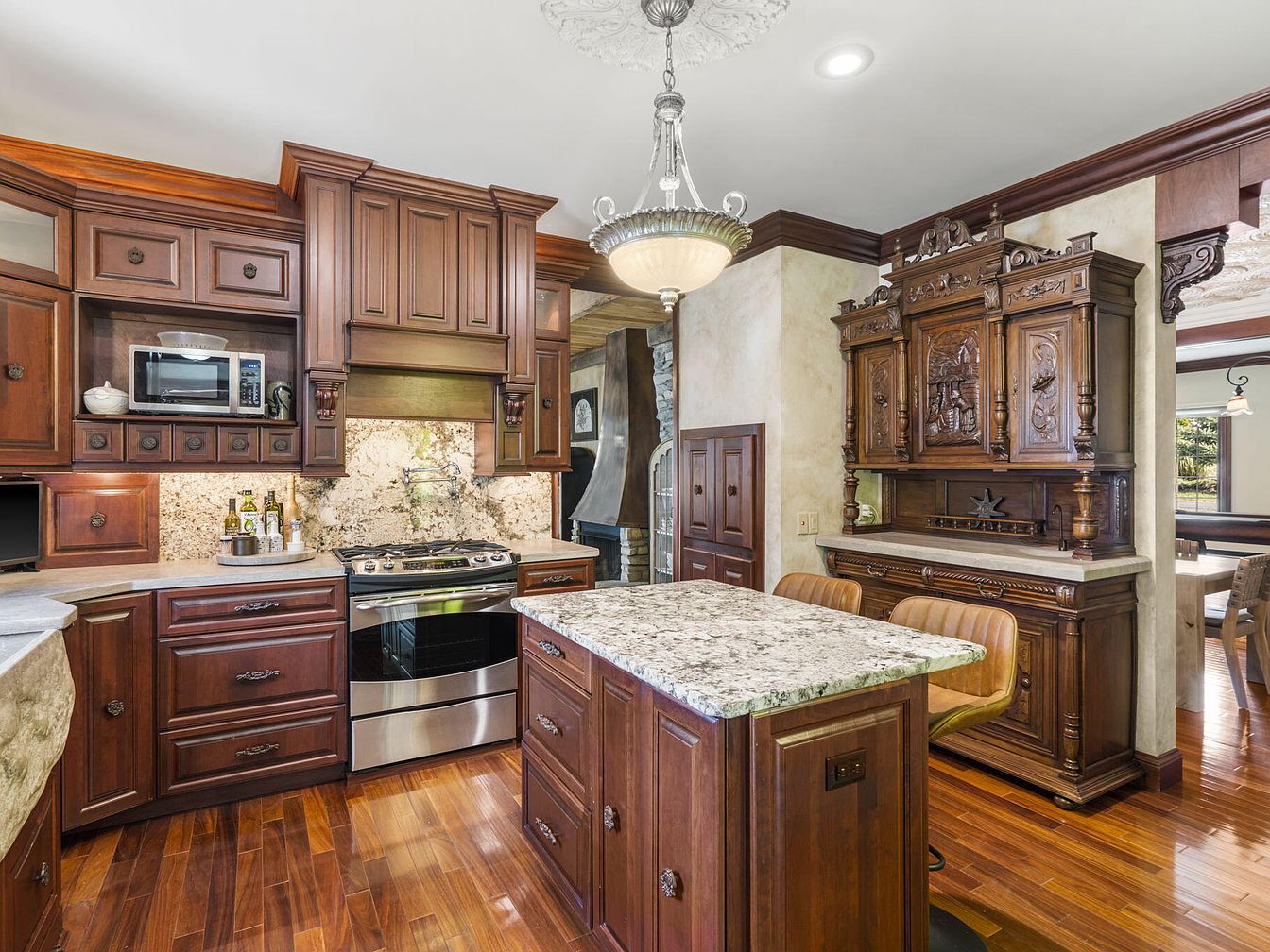 Rich cherry wood cabinetry fills the spacious kitchen, complemented by polished granite countertops and an intricately carved hutch along the wall. At the center, a large kitchen island with a matching stone surface offers ample prep space and seating for three, ideal for family gatherings and casual meals. Warm-toned wood floors add elegance and are easy to maintain. A chandelier delivers soft illumination while crown molding and ornate cabinet details lend a classic, timeless appeal. The layout ensures everything is within easy reach, making it convenient and safe for busy families who enjoy cooking together.