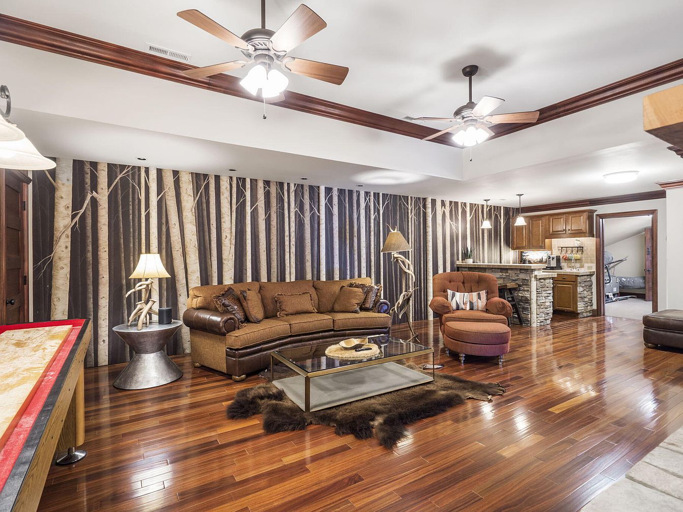 This spacious, open-concept living area features warm, glossy hardwood floors and a nature-inspired backdrop with a mural of tall birch trees, providing a cozy and inviting environment for families. The room is centered around a large, plush brown sofa and matching armchair with an ottoman, all made for relaxation and gatherings. A glass coffee table rests on a faux fur rug, adding warmth and texture. Unique log lamps and wooden accent tables enhance the rustic feel, while overhead ceiling fans and recessed lighting offer comfort and practicality. The adjacent kitchen, with its stone-accented breakfast bar, ensures easy family meals and socializing.