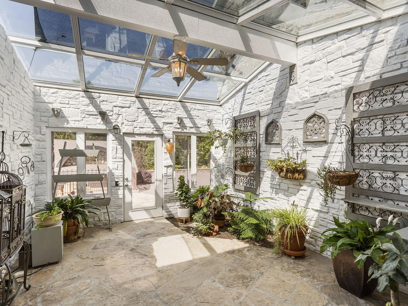 This inviting sunroom features a charming indoor garden atmosphere with white-painted stone walls and a glass-paneled ceiling that fills the space with natural light. The room is designed for relaxation, showcasing a neutral-toned stone floor and numerous potted plants that add vibrant greenery. Decorative ironwork, architectural wall accents, and hanging planters enhance the cozy, family-friendly vibe, making it a safe and bright play area for children or a tranquil retreat for adults. The double glass doors and large windows offer easy access to the outdoors while maintaining a connection to nature and encouraging family gatherings or quiet afternoons together.