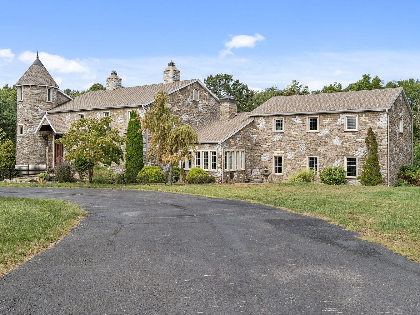 A welcoming stone façade highlights the front entrance of this spacious American home, designed with families in mind. The exterior blends rustic stonework and tan shingles, complemented by multiple windows that allow for abundant natural light. The entryway features double wooden doors framed by a charming arched portico, while a turret-style tower adds a touch of storybook appeal, sure to delight children. Mature landscaping offers privacy and space for outdoor play, with well-kept shrubs and trees lining the walkway. The expansive paved driveway provides ample parking and easy access, making this home ideal for gatherings and everyday family life.