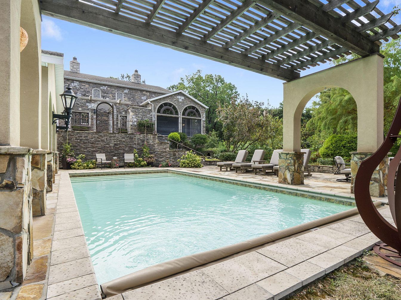 A spacious outdoor pool is framed by a sturdy pergola with stone pillars and cream-colored arches, providing partial shade and architectural elegance. The clear water is surrounded by beige pavers, creating a safe, non-slip area ideal for families with children. Multiple cushioned lounge chairs line the pool deck, inviting relaxation under the sun. Beyond the pool, beautifully manicured gardens and flowering shrubs enhance the tranquil atmosphere. In the background, a large stone house with arched windows and a wrought iron fence adds a sense of grandeur and character, while ample seating encourages gatherings and play for all ages.