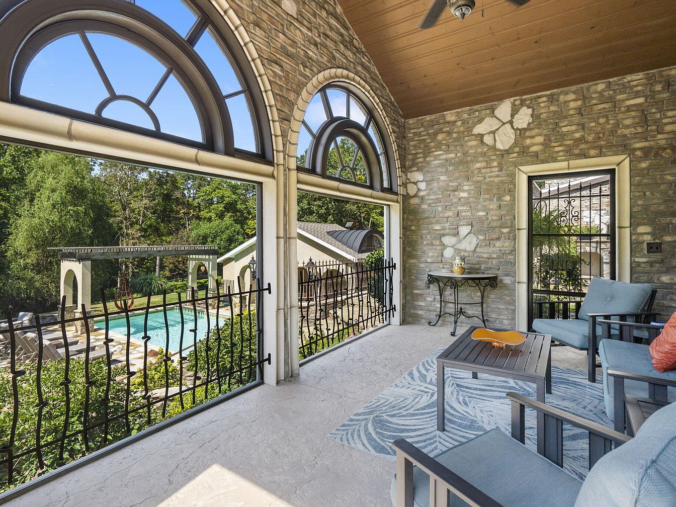 A spacious, covered patio features large arched windows framed with stonework, offering a panoramic view of a lush backyard and a bright blue pool. The patio floor is a light stone tile, complemented by a patterned blue area rug. Comfortable, cushioned patio chairs and a matching coffee table create a welcoming seating area, perfect for family gatherings or relaxation. The walls are finished in rustic stone with decorative white accents, and an elegant wrought iron table sits against one wall. The ceiling is wood-paneled, and an overhead fan adds comfort on warm days. Black iron railing provides safety for children and pets.