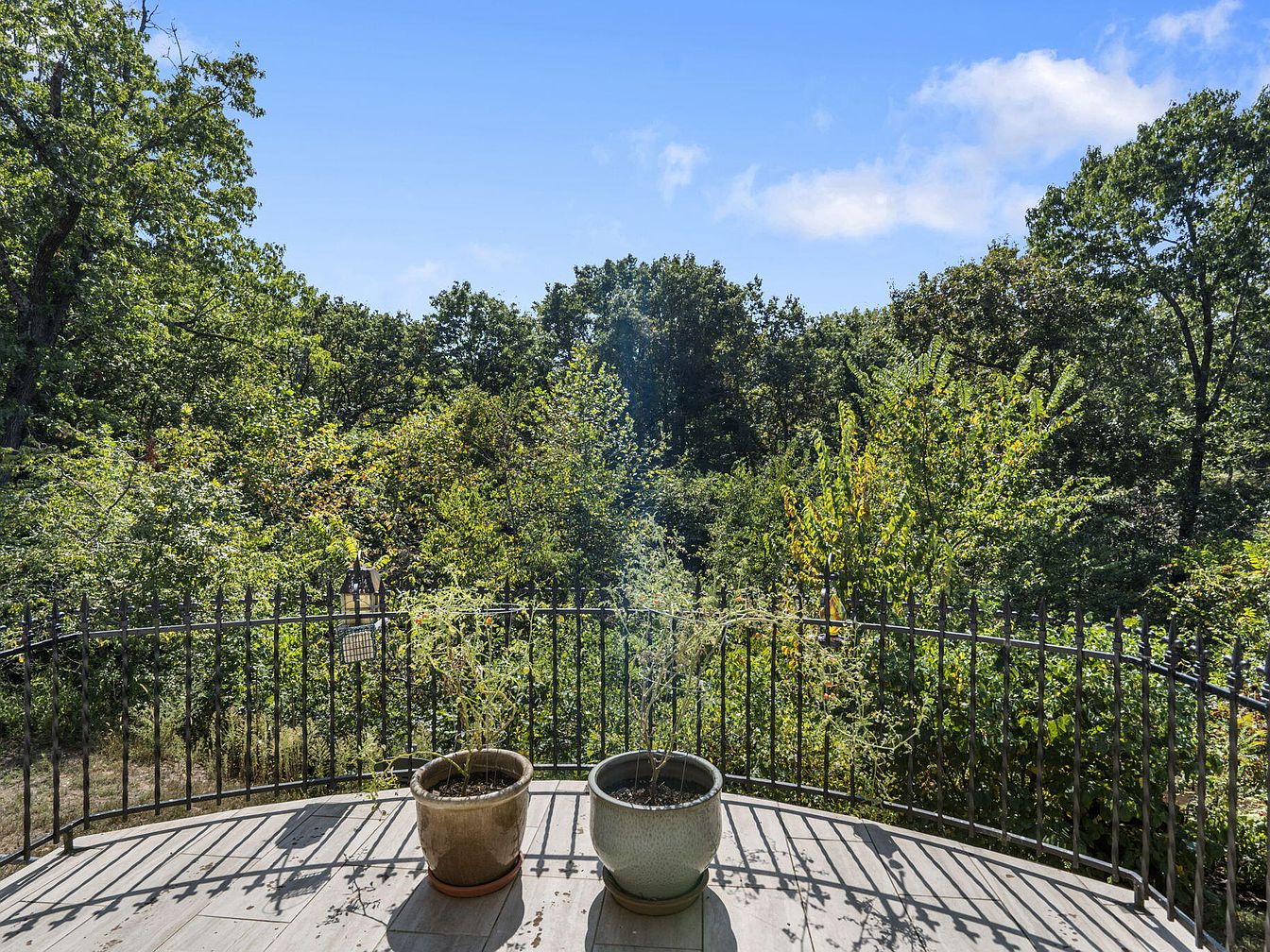 A curved balcony with classic black railings overlooks a lush green woodland, offering a serene and inviting outdoor space ideal for family relaxation. The balcony is finished with wide, pale stone tiles that create a clean and durable surface, safe for children to play or for placing small furniture. Two large ceramic planters, each holding vibrant plants, add a natural and homely touch to the setting. This elevated spot embraces nature and privacy, creating an airy retreat with blue skies above and sun-dappled leaves all around, making it perfect for family gatherings or quiet mornings together.