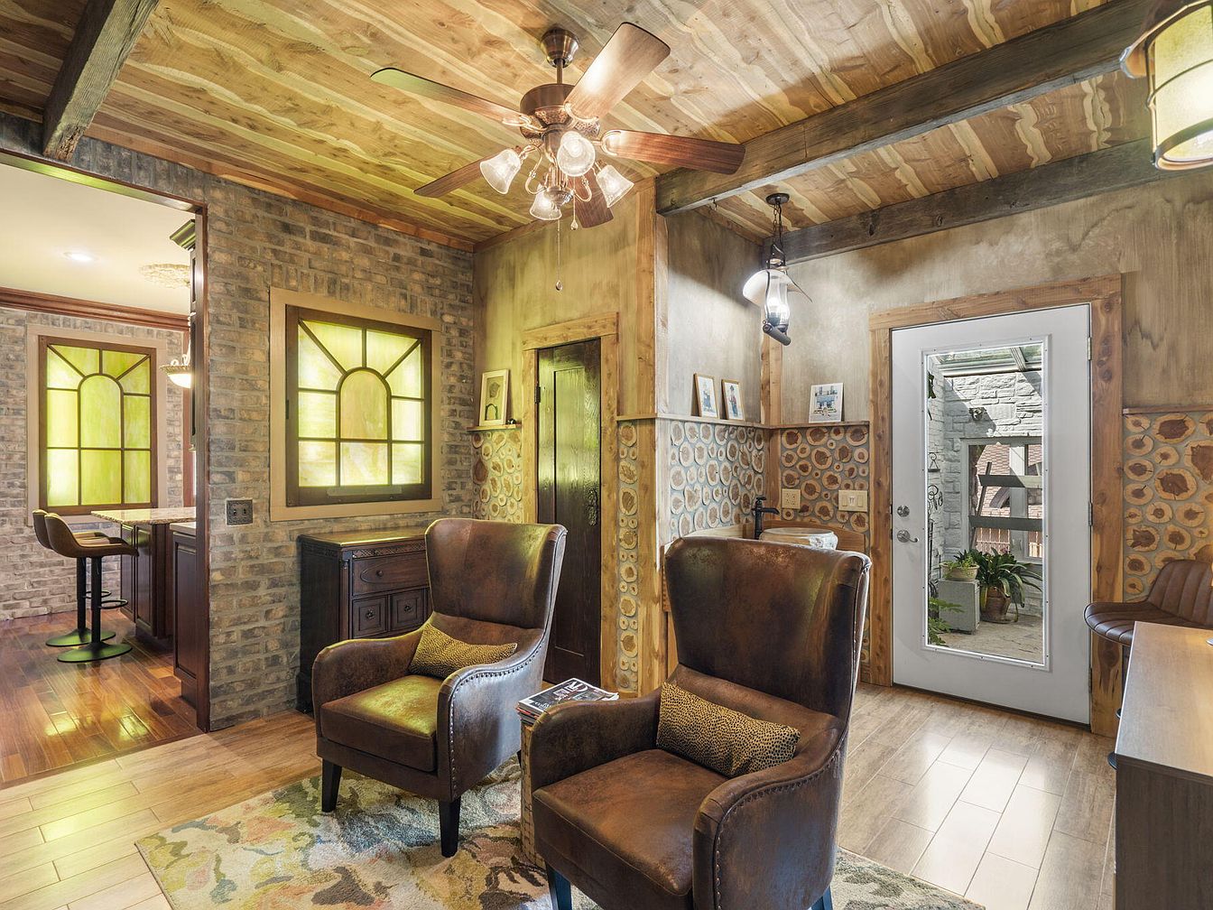 A welcoming sitting area is bathed in warm, natural light, featuring two large brown leather armchairs perfect for family relaxation or reading. The space is defined by a rustic, wood-beamed ceiling paired with a matching wood floor, and brick accent walls providing a blend of warmth and texture. Circular wood slices decorate the lower half of the walls, adding a playful, natural pattern. The area has a soft, patterned rug, a ceiling fan with glass lights, and family photos displayed on a narrow shelf. A glass door opens to a patio, encouraging indoor-outdoor living for all ages.